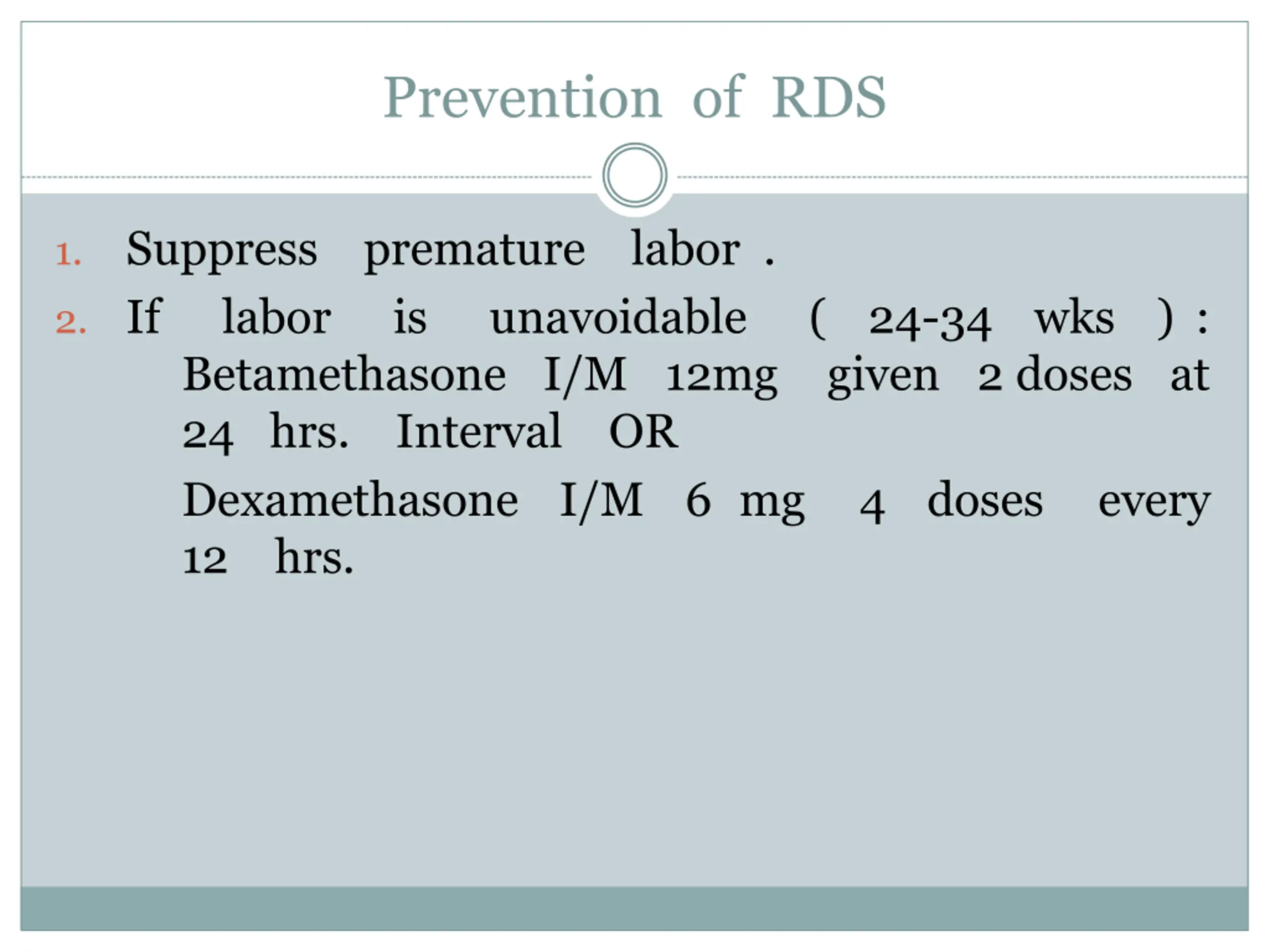 Prevention of RDS Suppress labor Betamethasone I/M 12mg 24 hrs. Interval Dexamethasone I/M 6 mg 12 hrs. premature is labor . 1. 2. If unavoidable ( 24-34 wks ) : given 2 doses at OR 4 doses every