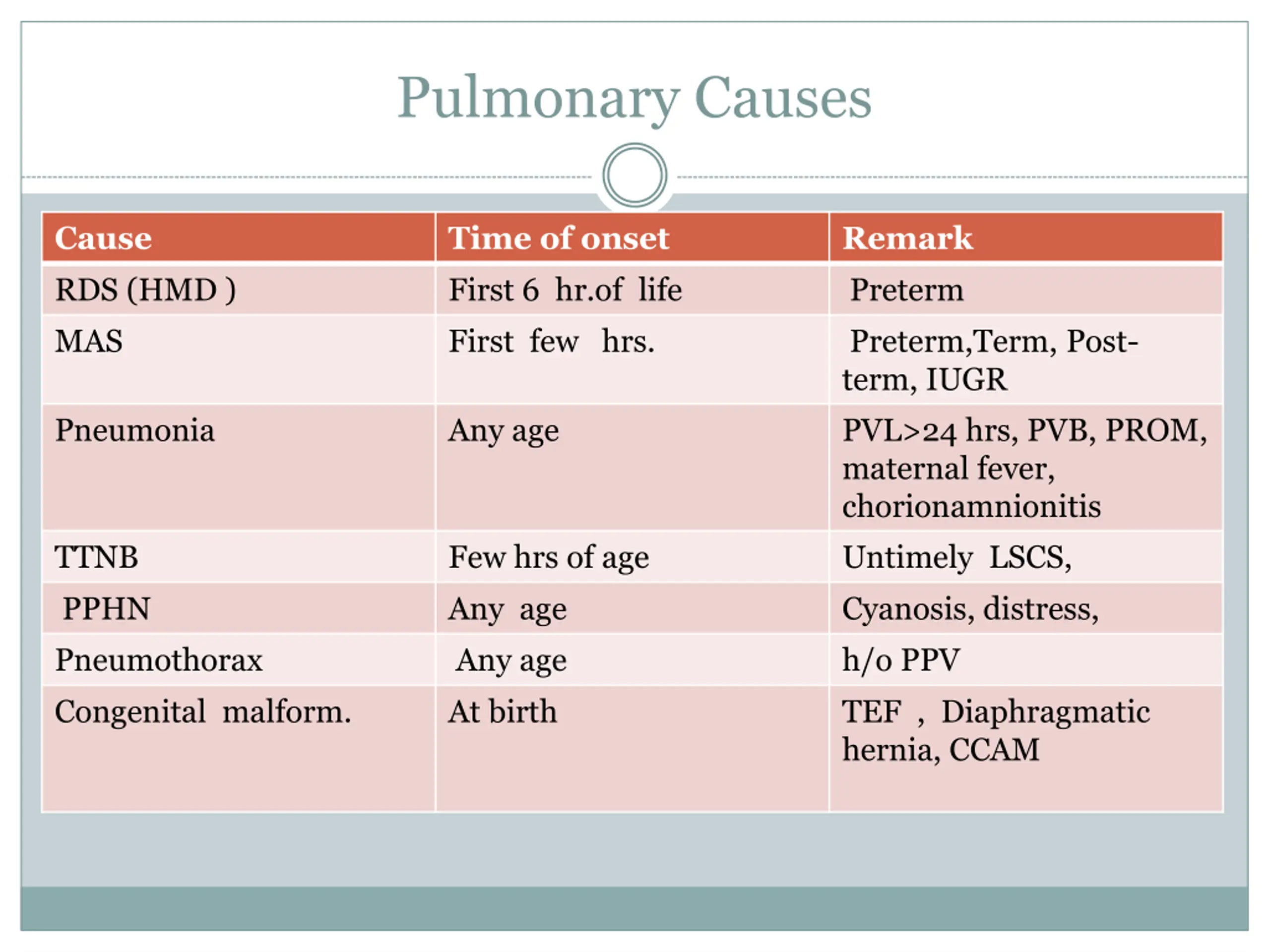 Pulmonary Causes Cause RDS (HMD ) MAS Time of onset First 6 hr.of life First few hrs. Remark Preterm Preterm,Term, Post- term, IUGR PVL>24 hrs, PVB, PROM, maternal fever, chorionamnionitis Untimely LSCS, Cyanosis, distress, h/o PPV TEF , Diaphragmatic hernia, CCAM Pneumonia Any age TTNB PPHN Pneumothorax Congenital malform. Few hrs of age Any age Any age At birth