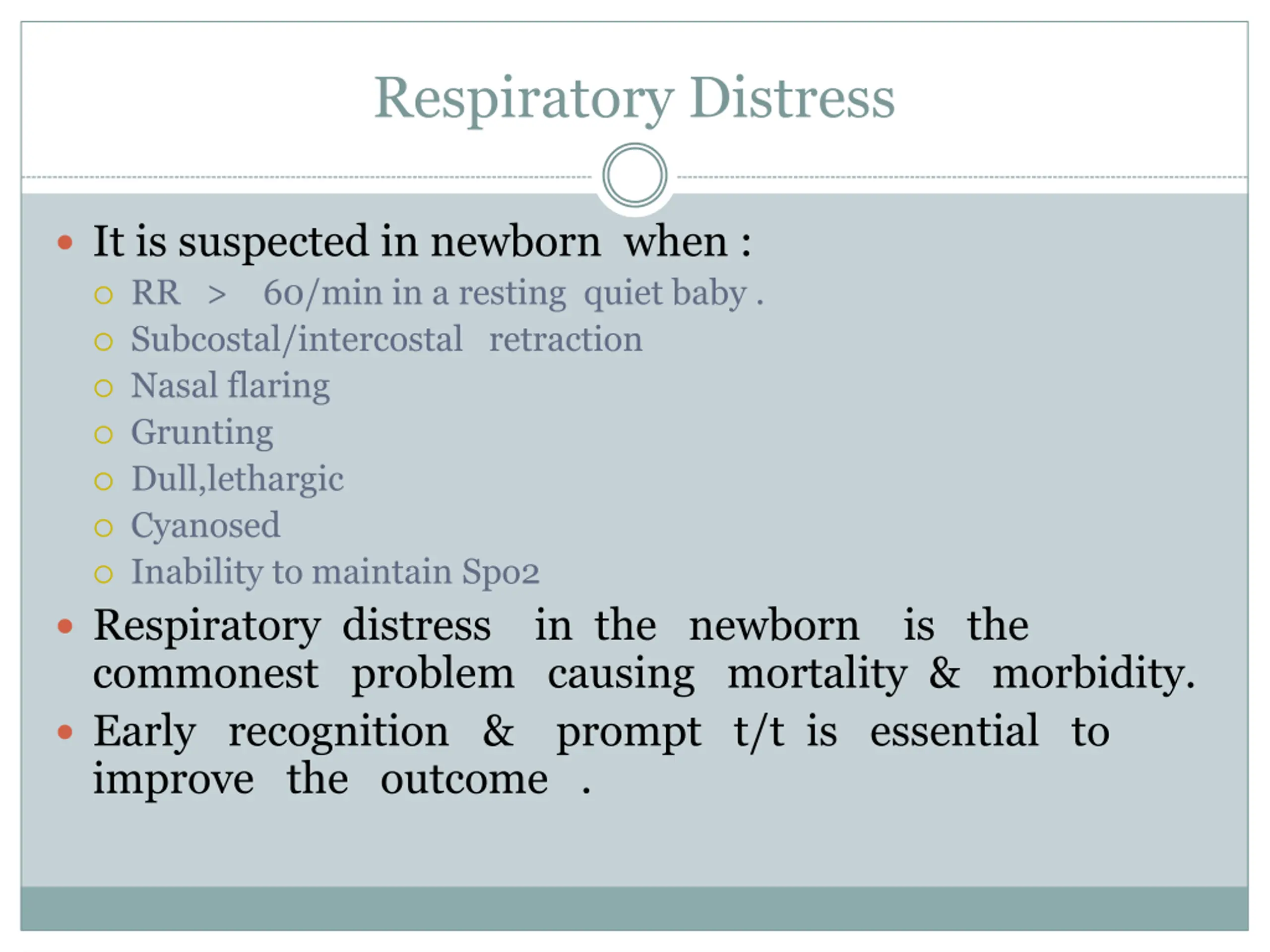 Respiratory Distress It is suspected in newborn when : RR > 60/min in a resting quiet baby . Subcostal/intercostal retraction Nasal flaring Grunting Dull,lethargic Cyanosed Inability to maintain Spo2 Respiratory distress in the newborn is the commonest problem causing mortality & morbidity. Early recognition & prompt t/t is essential to improve the outcome .