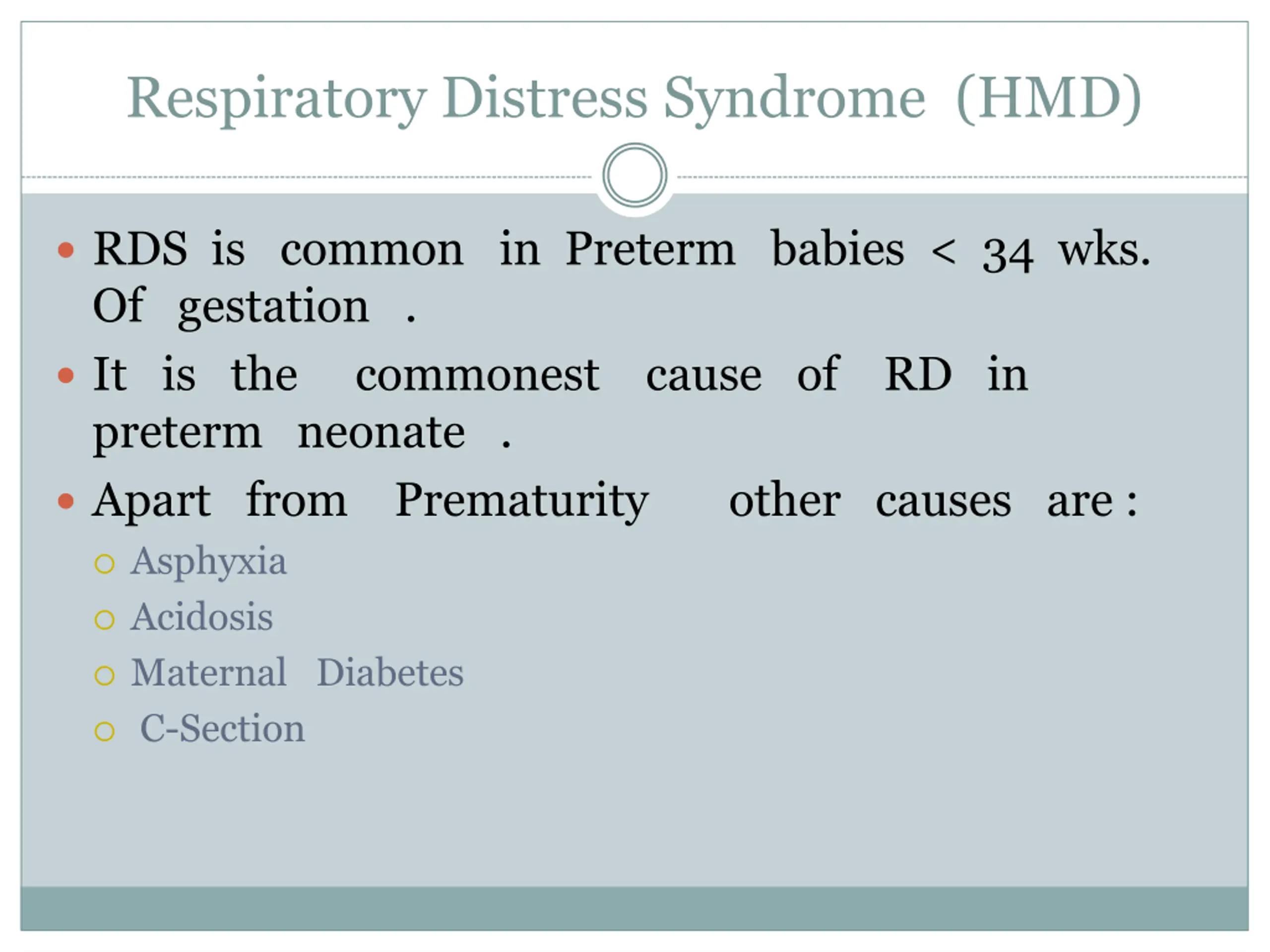 Respiratory Distress Syndrome (HMD) RDS is common in Preterm babies < 34 wks. Of gestation . It is the commonest cause of RD in preterm neonate . Apart from Prematurity other causes are : Asphyxia Acidosis Maternal Diabetes C-Section