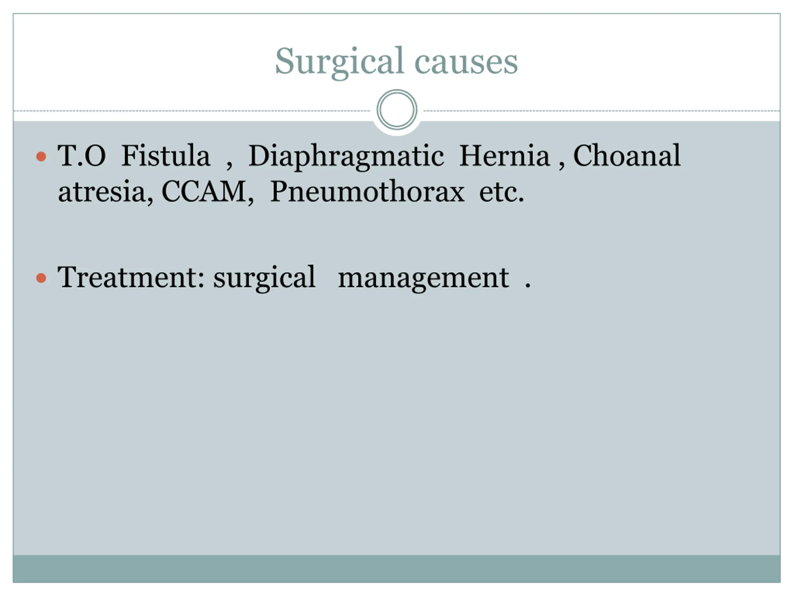 Surgical causes T.O Fistula , Diaphragmatic Hernia , Choanal atresia, CCAM, Pneumothorax etc. Treatment: surgical management .