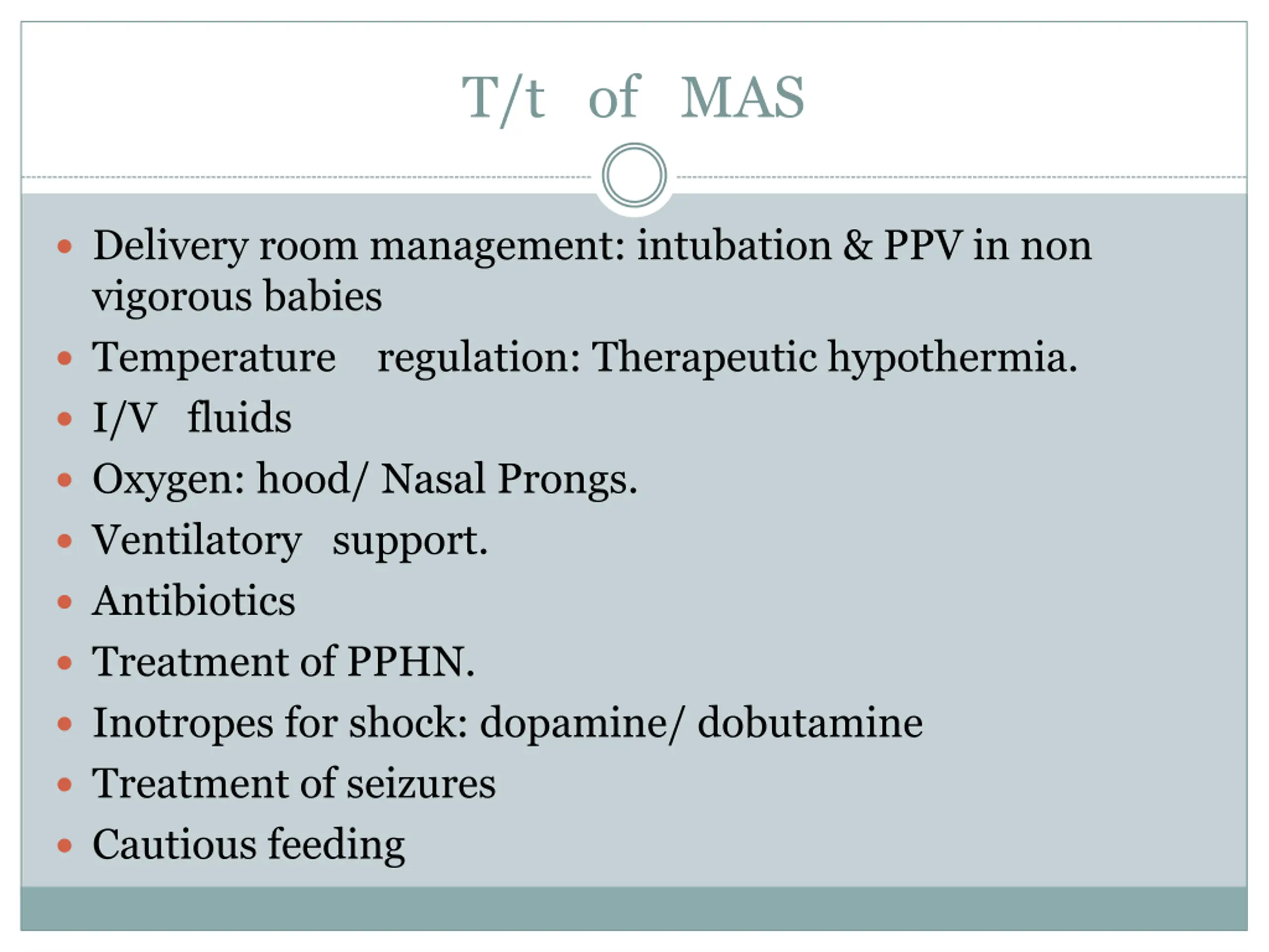 T/t of MAS Delivery room management: intubation & PPV in non vigorous babies Temperature regulation: Therapeutic hypothermia. I/V fluids Oxygen: hood/ Nasal Prongs. Ventilatory support. Antibiotics Treatment of PPHN. Inotropes for shock: dopamine/ dobutamine Treatment of seizures Cautious feeding