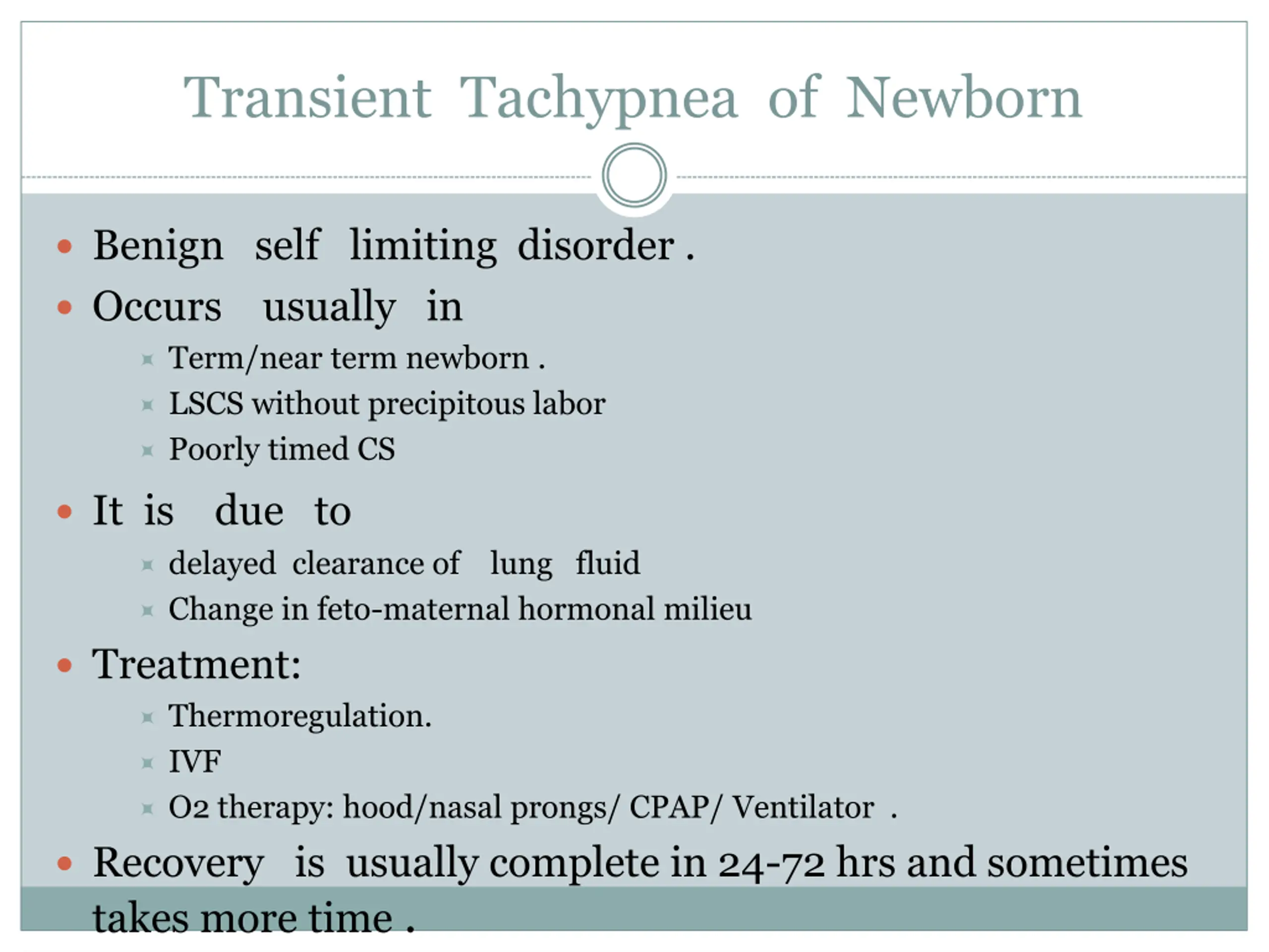 Transient Tachypnea of Newborn Benign self limiting disorder . Occurs usually in Term/near term newborn . LSCS without precipitous labor Poorly timed CS It is due to delayed clearance of lung fluid Change in feto-maternal hormonal milieu Treatment: Thermoregulation. IVF O2 therapy: hood/nasal prongs/ CPAP/ Ventilator . Recovery is usually complete in 24-72 hrs and sometimes takes more time .