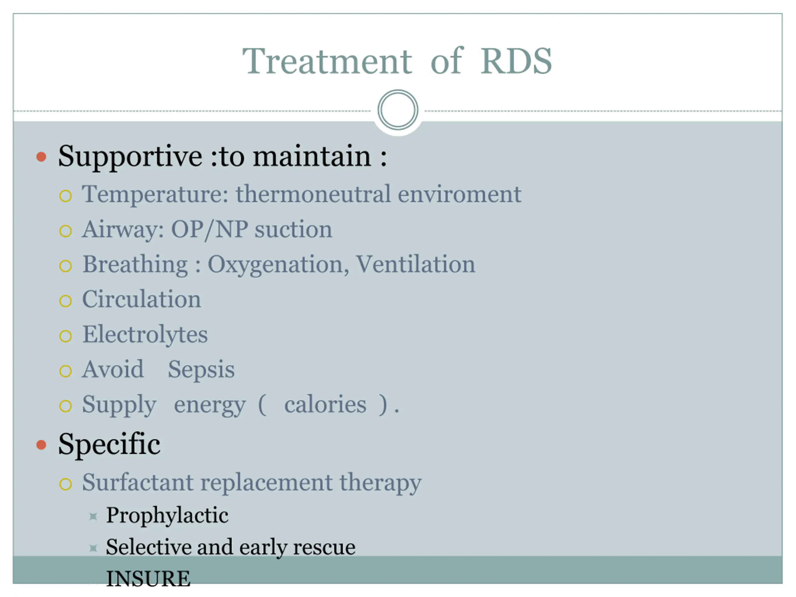 Treatment of RDS Supportive :to maintain : Temperature: thermoneutral enviroment Airway: OP/NP suction Breathing : Oxygenation, Ventilation Circulation Electrolytes Avoid Sepsis Supply energy ( calories ) . Specific Surfactant replacement therapy Prophylactic Selective and early rescue INSURE