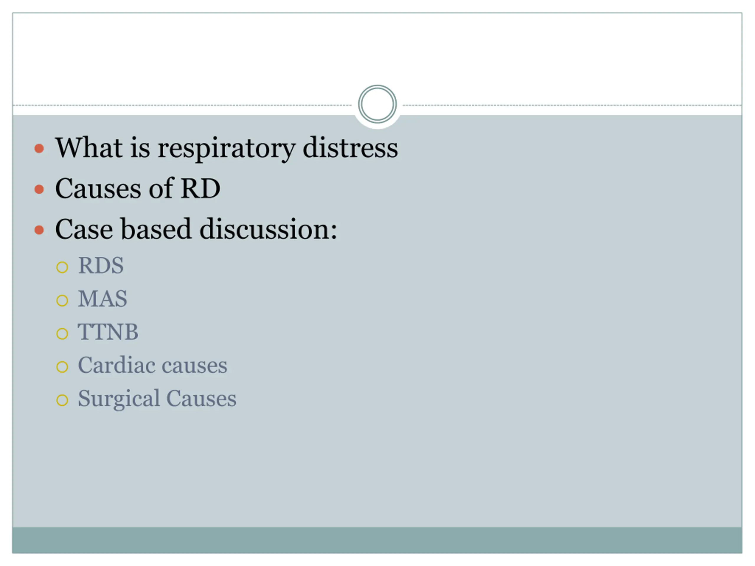 What is respiratory distress Causes of RD Case based discussion: RDS MAS TTNB Cardiac causes Surgical Causes