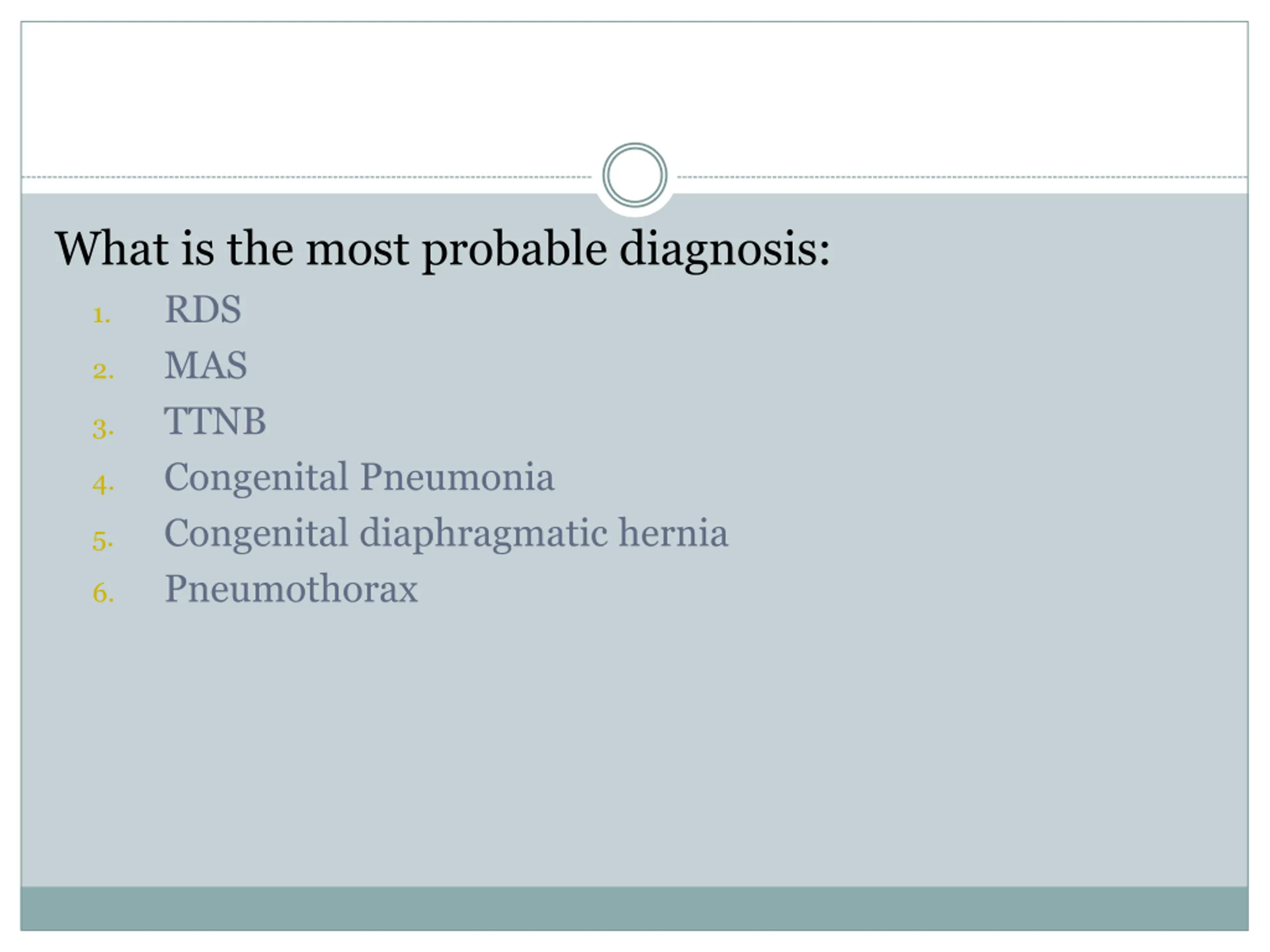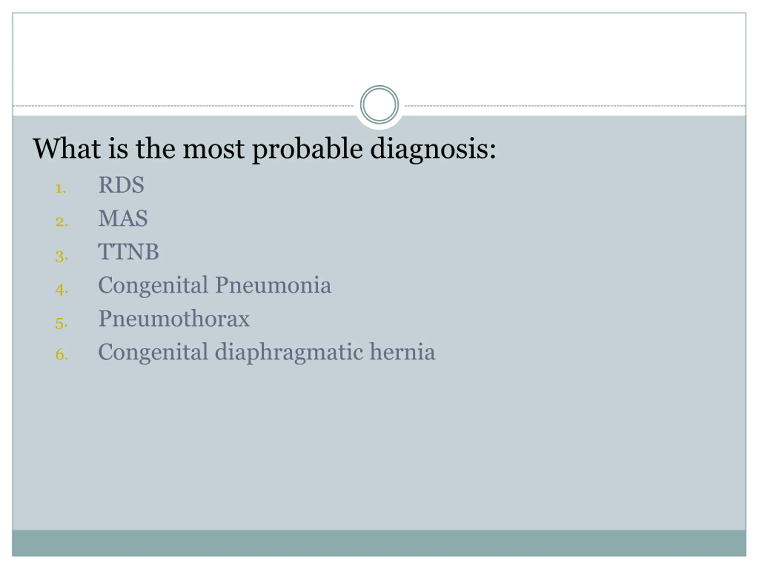 What is the most probable diagnosis: RDS MAS TTNB Congenital Pneumonia Pneumothorax Congenital diaphragmatic hernia 1. 2. 3. 4. 5. 6.