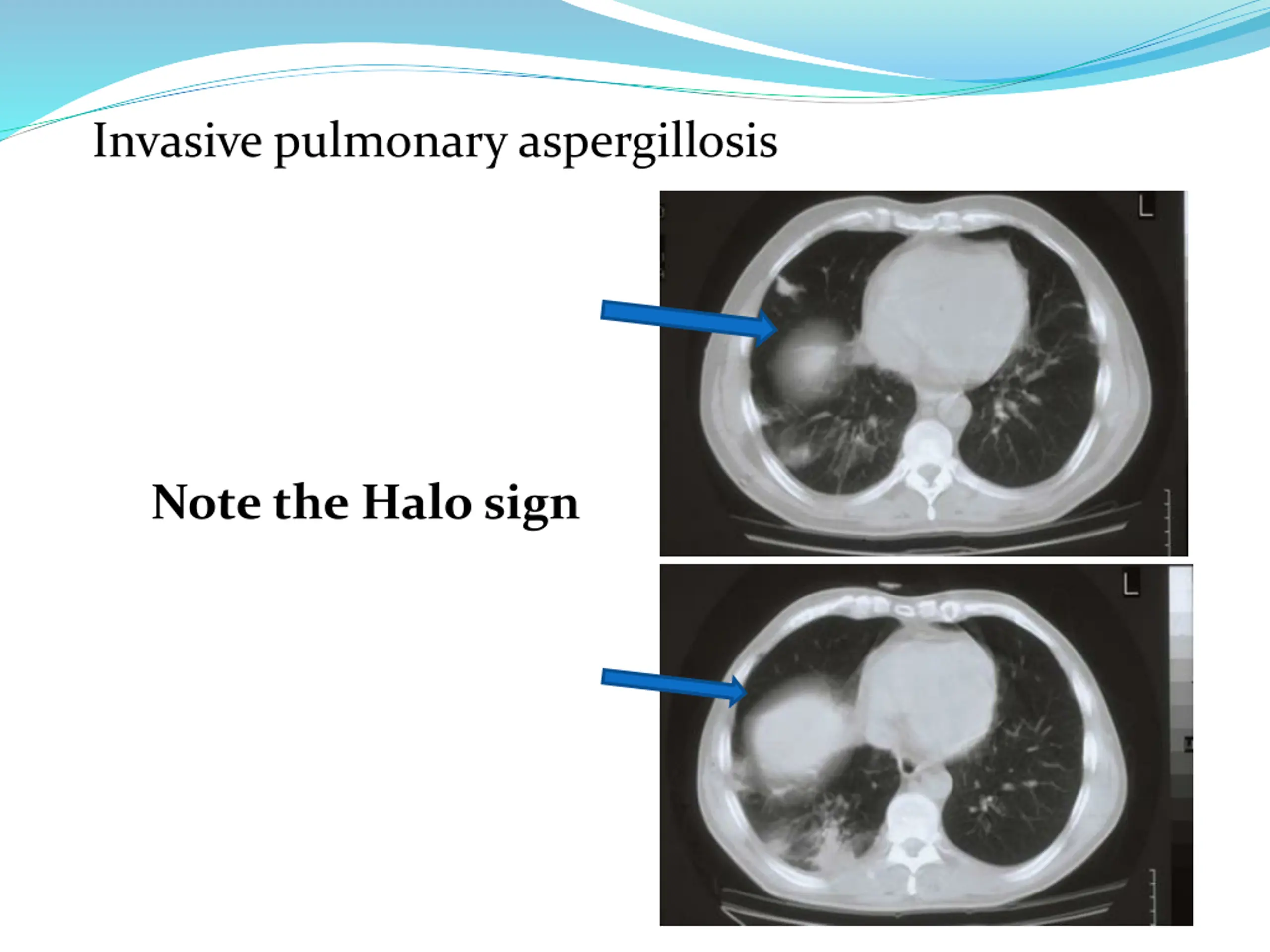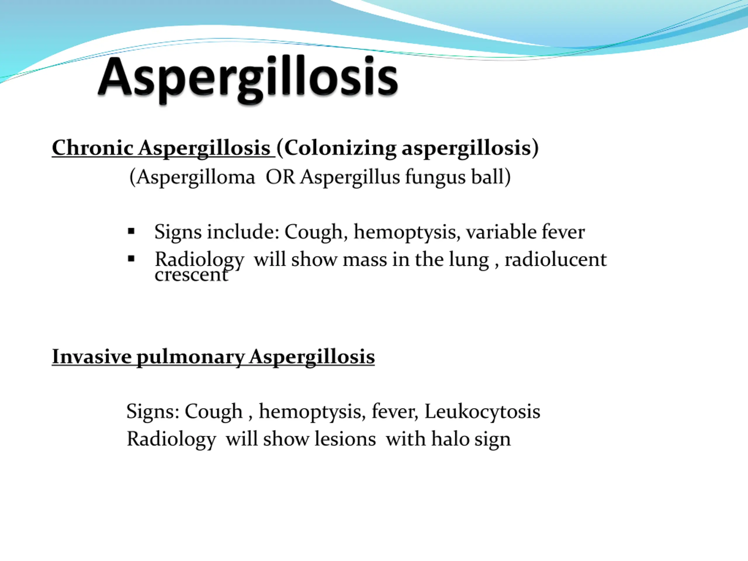 Chronic Aspergillosis (Colonizing aspergillosis) (Aspergilloma OR Aspergillus fungus ball) Signs include: Cough, hemoptysis, variable fever Radiology will show mass in the lung , radiolucent crescent Invasive pulmonary Aspergillosis Signs: Cough , hemoptysis, fever, Leukocytosis Radiology will show lesions with halo sign