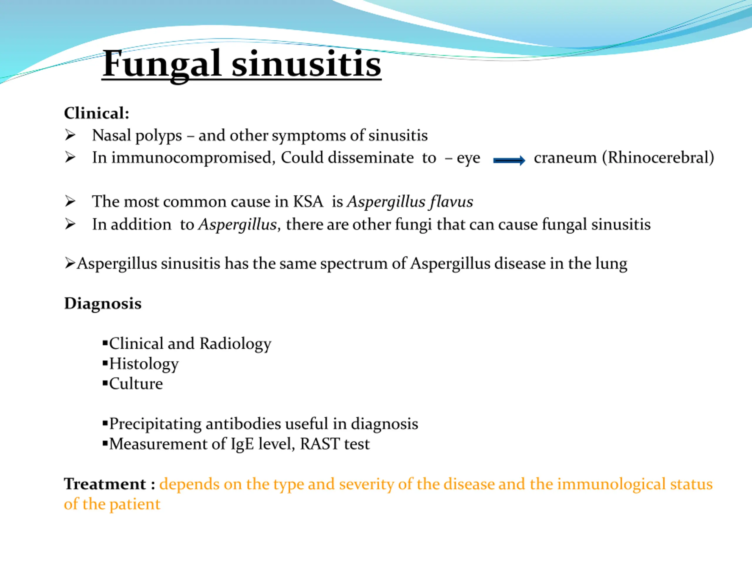Fungal sinusitis Clinical: Nasal polyps and other symptoms of sinusitis In immunocompromised, Could disseminate to eye craneum (Rhinocerebral) The most common cause in KSA is Aspergillus flavus In addition to Aspergillus, there are other fungi that can cause fungal sinusitis Aspergillus sinusitis has the same spectrum of Aspergillus disease in the lung Diagnosis Clinical and Radiology Histology Culture Precipitating antibodies useful in diagnosis Measurement of IgE level, RAST test Treatment : depends on the type and severity of the disease and the immunological status of the patient