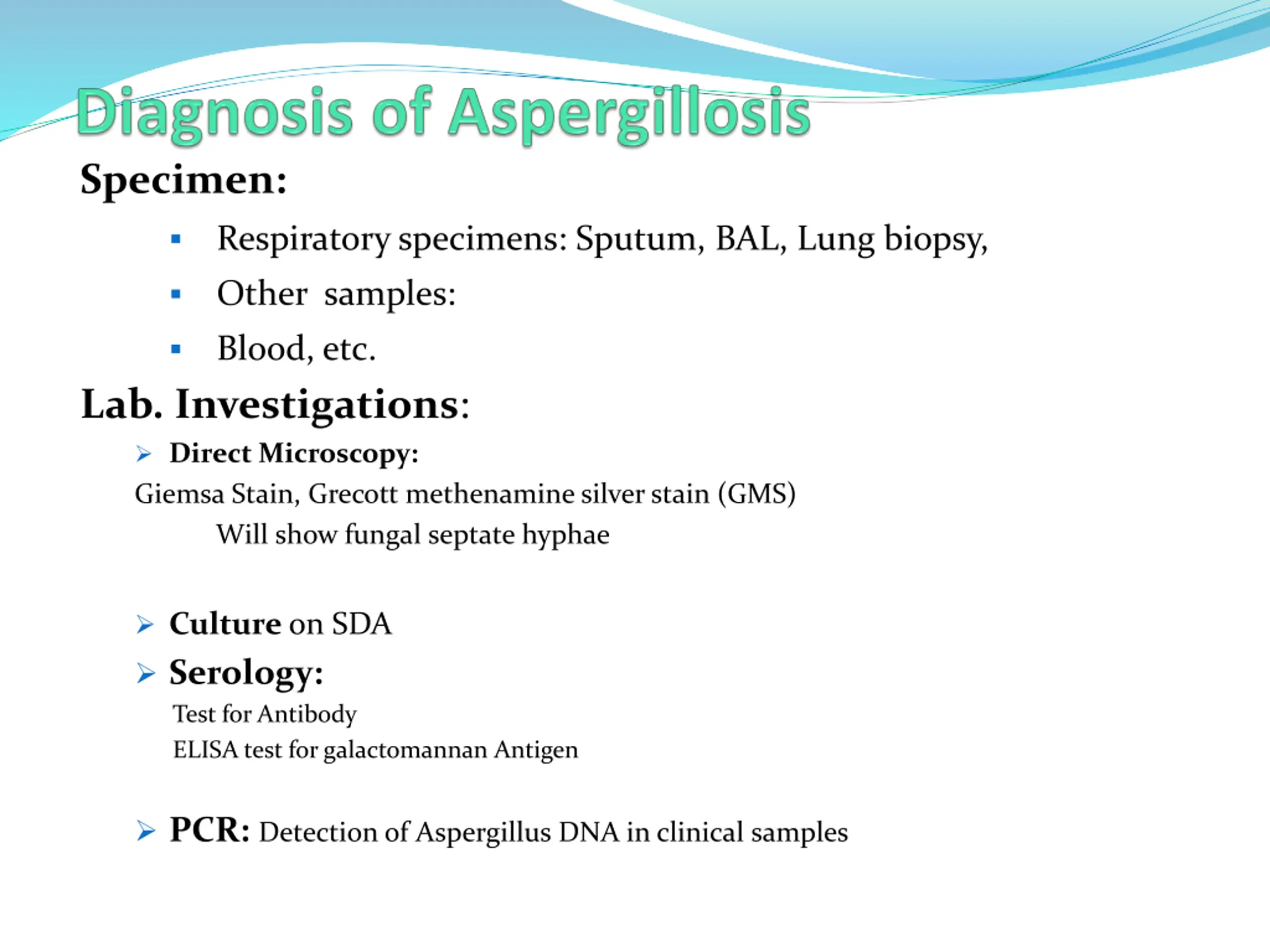 Specimen: Respiratory specimens: Sputum, BAL, Lung biopsy, Other samples: Blood, etc. Lab. Investigations: Direct Microscopy: Giemsa Stain, Grecott methenamine silver stain (GMS) Will show fungal septate hyphae Culture on SDA Serology: Test for Antibody ELISA test for galactomannan Antigen PCR: Detection of Aspergillus DNA in clinical samples