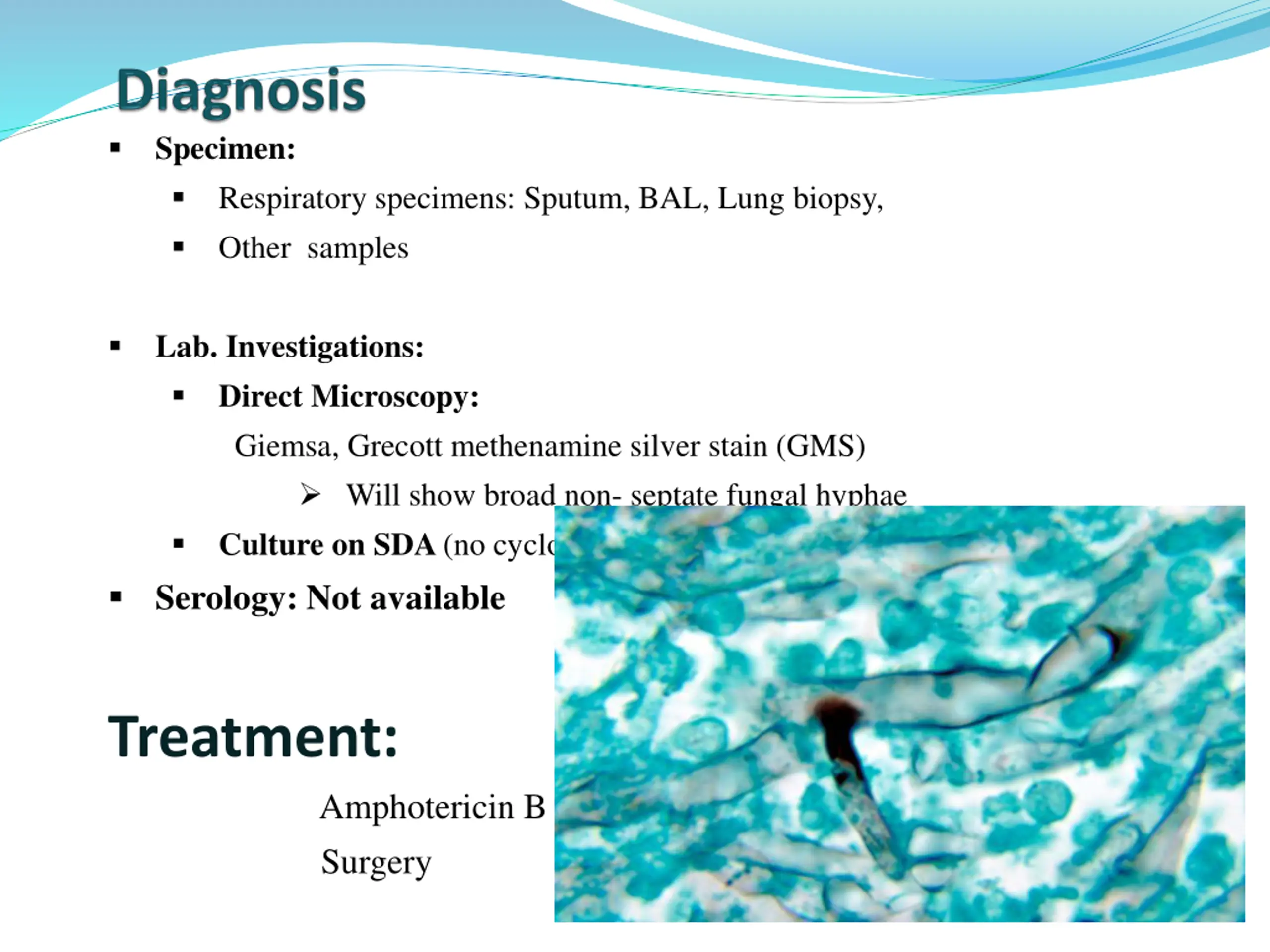 Specimen: Respiratory specimens: Sputum, BAL, Lung biopsy, Other samples Lab. Investigations: Direct Microscopy: Giemsa, Grecott methenamine silver stain (GMS) Will show broad non- septate fungal hyphae Culture on SDA (no cycloheximide) Serology: Not available Treatment: Amphotericin B Surgery