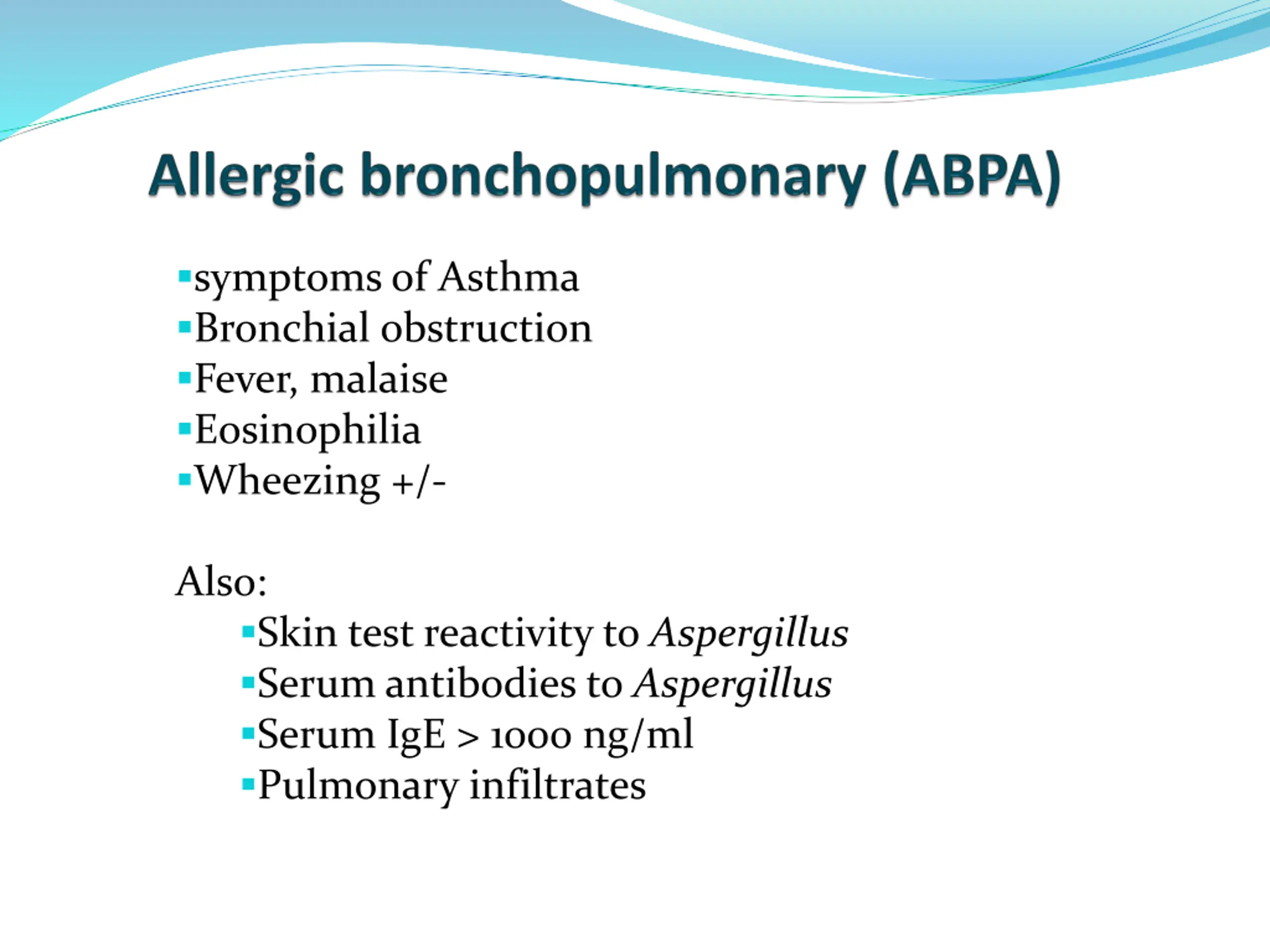 symptoms of Asthma Bronchial obstruction Fever, malaise Eosinophilia Wheezing +/- Also: Skin test reactivity to Aspergillus Serum antibodies to Aspergillus Serum IgE > 1000 ng/ml Pulmonary infiltrates