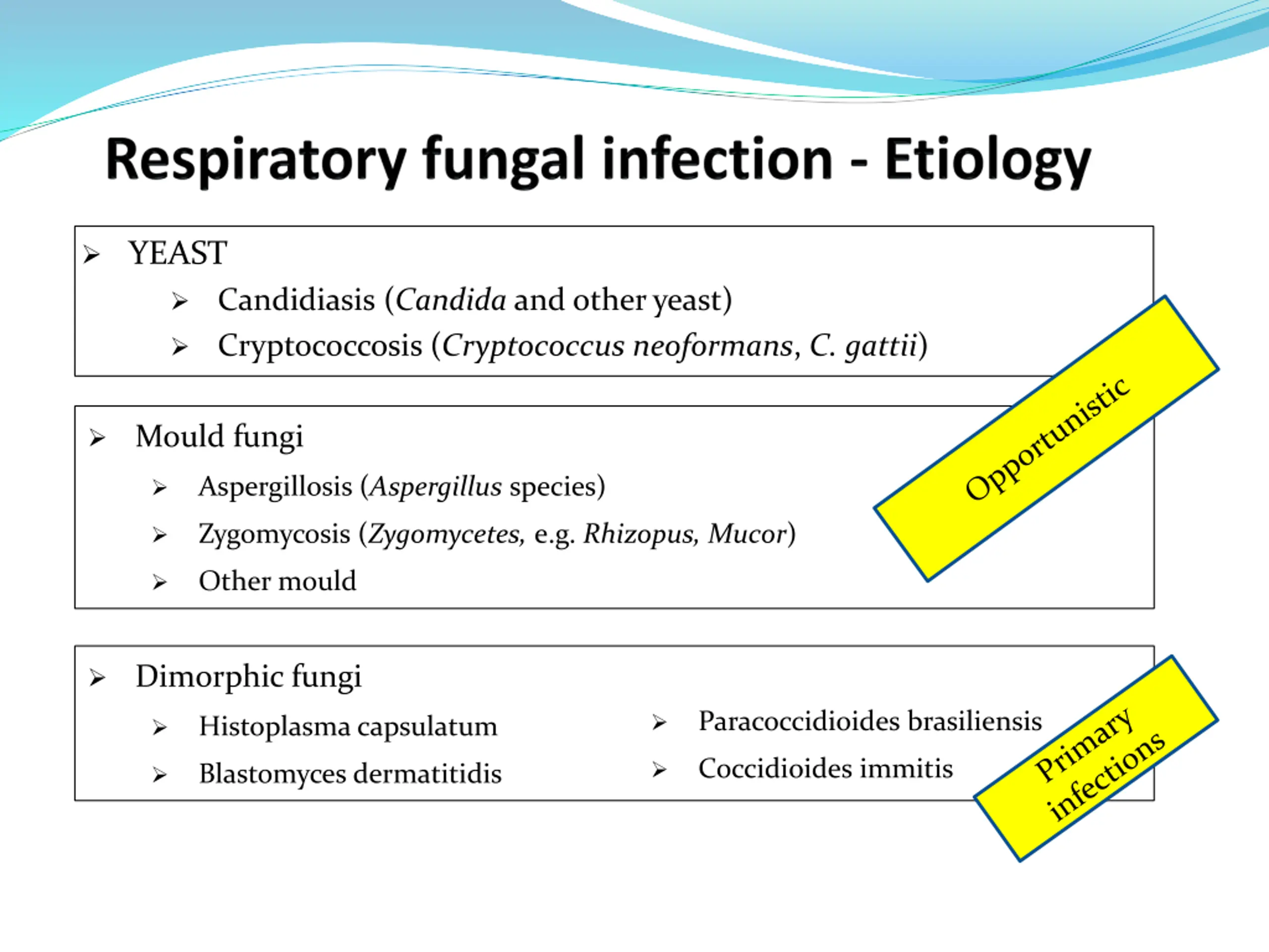 YEAST Candidiasis (Candida and other yeast) Cryptococcosis (Cryptococcus neoformans, C. gattii) Mould fungi Aspergillosis (Aspergillus species) Zygomycosis (Zygomycetes, e.g. Rhizopus, Mucor) Other mould Dimorphic fungi Paracoccidioides brasiliensis Histoplasma capsulatum Coccidioides immitis Blastomyces dermatitidis
