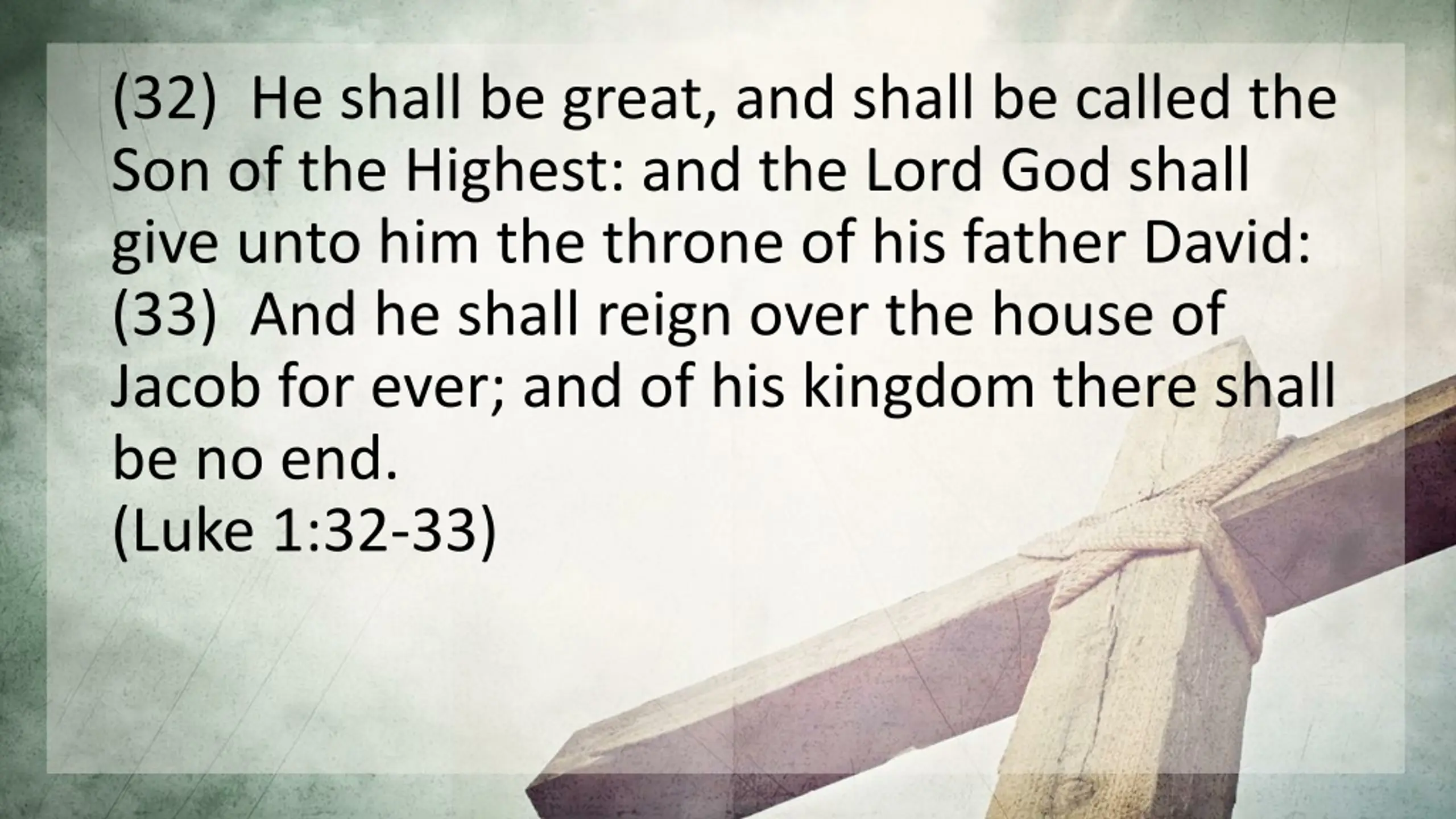 (32) He shall be great, and shall be called the Son of the Highest: and the Lord God shall give unto him the throne of his father David: (33) And he shall reign over the house of Jacob for ever; and of his kingdom there shall be no end. (Luke 1:32-33)