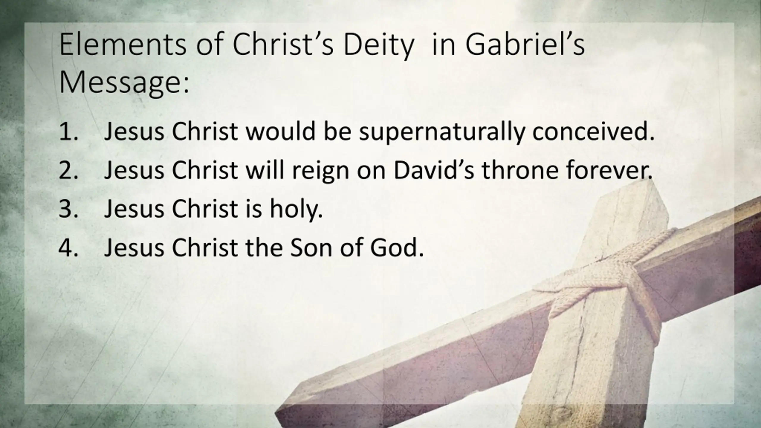 Elements of Christs Deity in Gabriels Message: 1. Jesus Christ would be supernaturally conceived. 2. Jesus Christ will reign on David s throne forever. 3. Jesus Christ is holy.