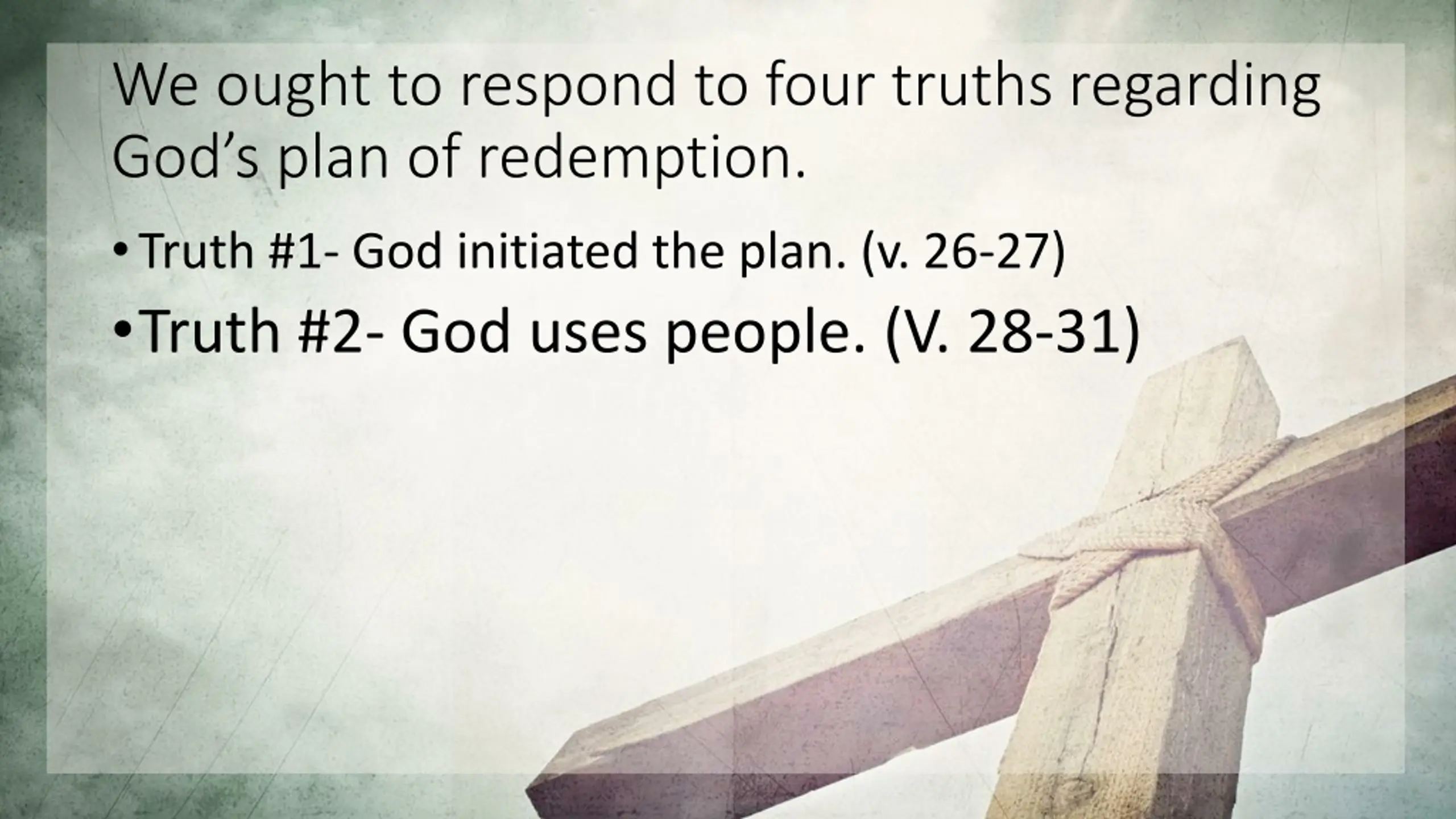 We ought to respond to four truths regarding God s plan of redemption. Truth #1- God initiated the plan. (v. 26-27) Truth #2- God uses people. (V. 28-31)