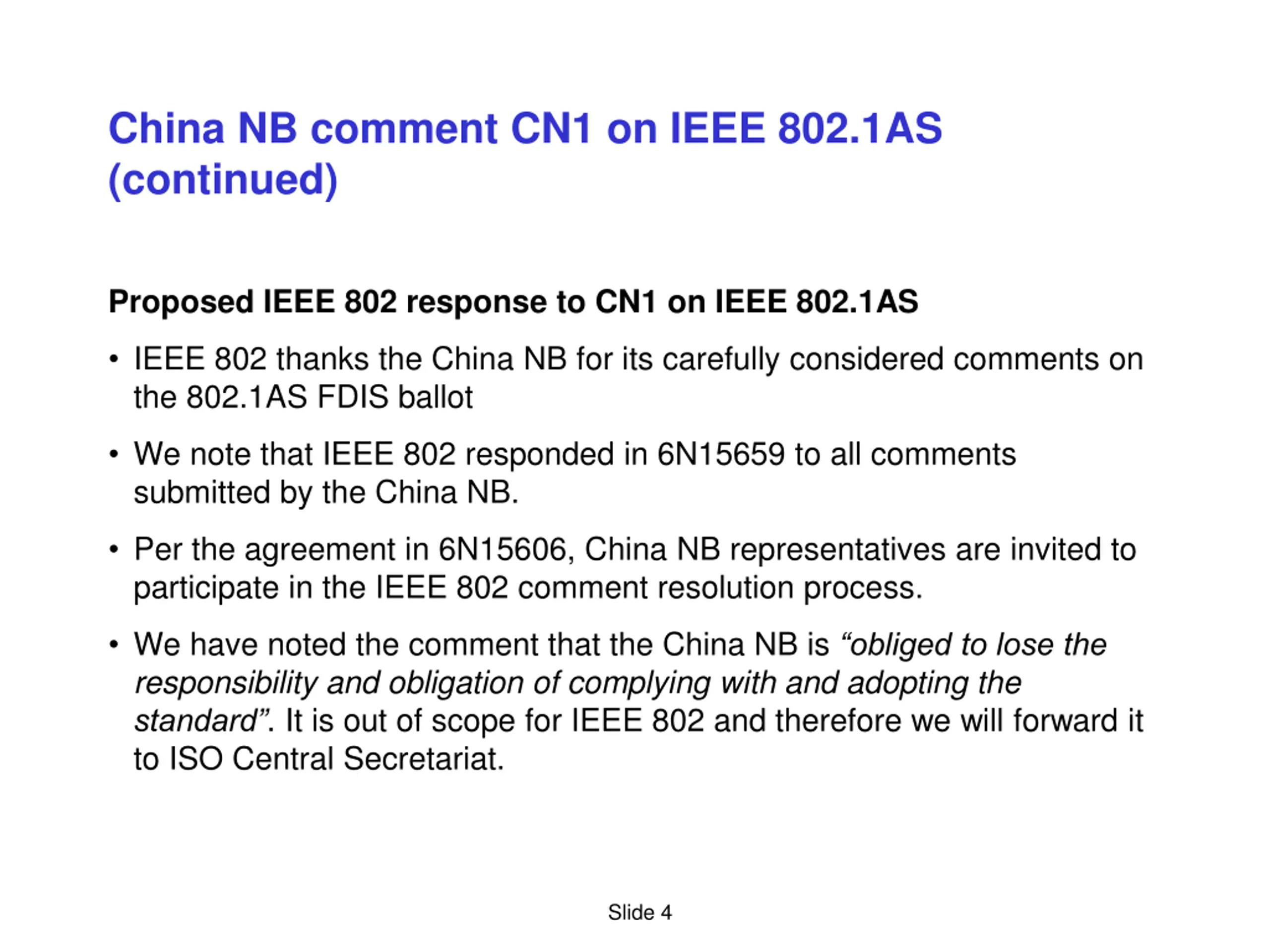 China NB comment CN1 on IEEE 802.1AS (continued) Proposed IEEE 802 response to CN1 on IEEE 802.1AS IEEE 802 thanks the China NB for its carefully considered comments on the 802.1AS FDIS ballot We note that IEEE 802 responded in 6N15659 to all comments submitted by the China NB. Per the agreement in 6N15606, China NB representatives are invited to participate in the IEEE 802 comment resolution process. We have noted the comment that the China NB is obliged to lose the responsibility and obligation of complying with and adopting the standard . It is out of scope for IEEE 802 and therefore we will forward it to ISO Central Secretariat. Slide 4