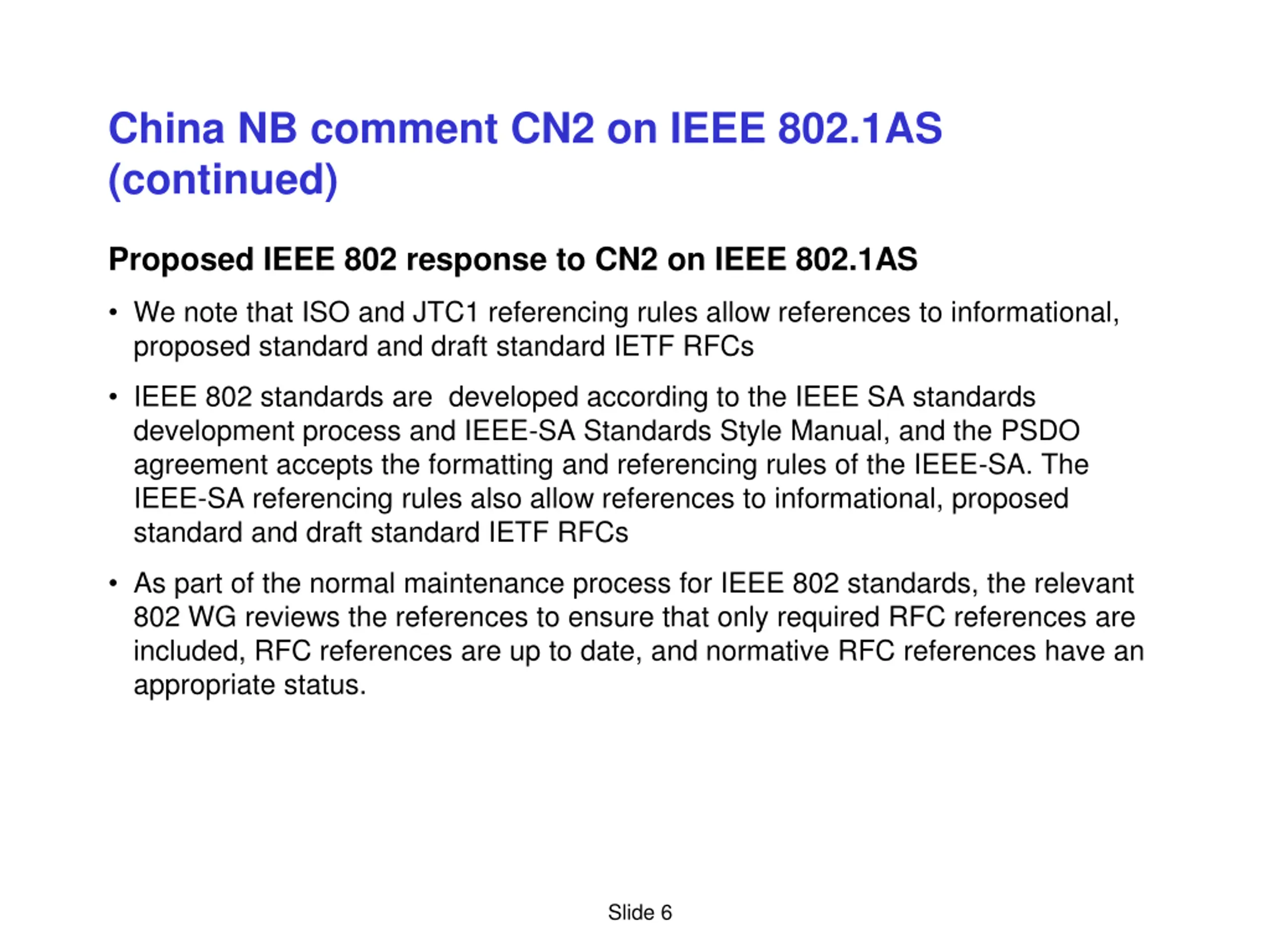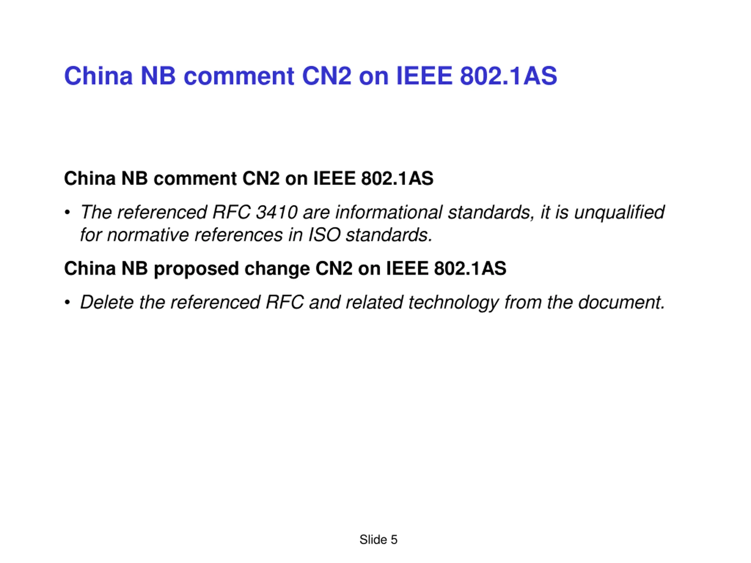 China NB comment CN2 on IEEE 802.1AS China NB comment CN2 on IEEE 802.1AS The referenced RFC 3410 are informational standards, it is unqualified for normative references in ISO standards. China NB proposed change CN2 on IEEE 802.1AS Delete the referenced RFC and related technology from the document. Slide 5