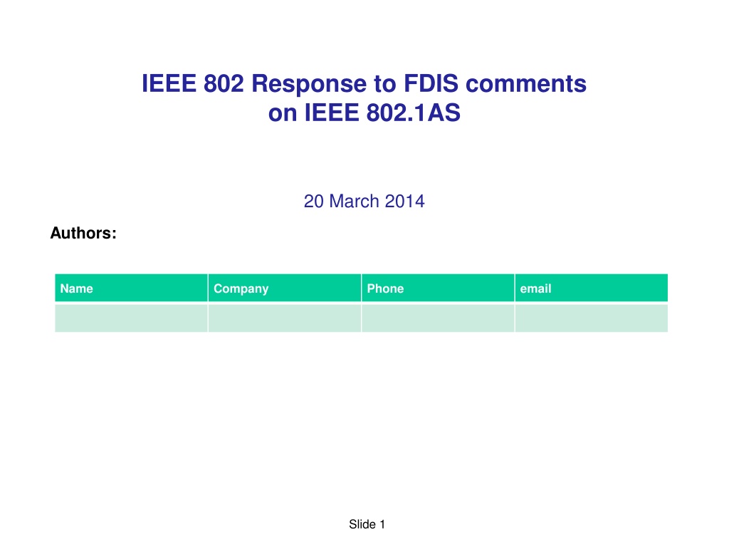 IEEE 802 Response to FDIS comments on IEEE 802.1AS 20 March 2014 Authors: Name Company Phone email Slide 1