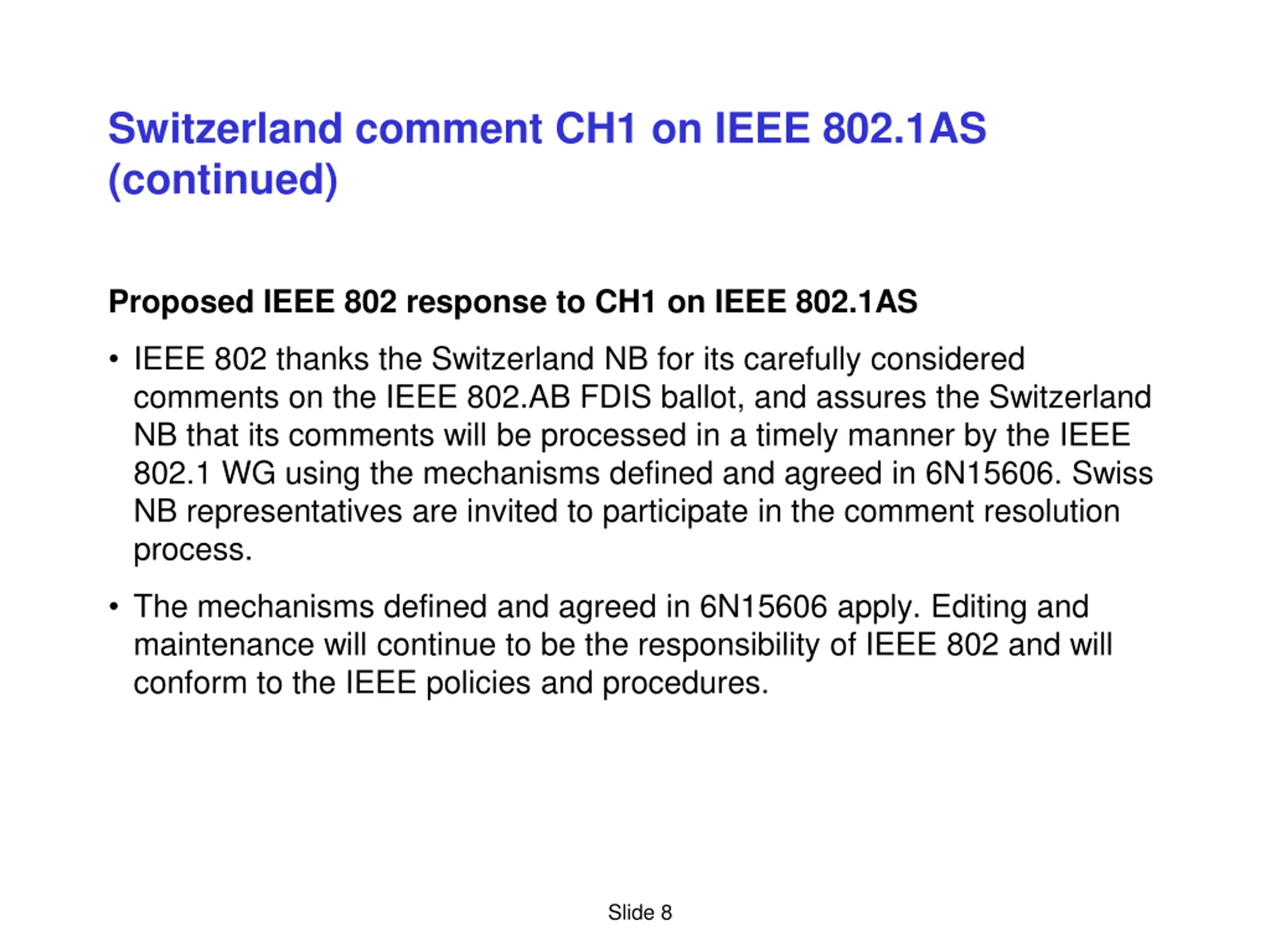 Switzerland comment CH1 on IEEE 802.1AS Switzerland comment CH1 on IEEE 802.1AS In a conventional DIS or DIS fast-track ballot, the subsequent comments would be issued with a DISAPPROVE vote, which would be turned into APPROVAL if the comments were satisfactorily resolved. The FDIS fast-track however postpones, by 2.7 of the ISO/IEC Directives, Part 1, such resolution to the next review of the standard. Furthermore, affirmative votes to an FDIS cannot be made conditional on the resolution of any comments. However, we wish ISO/IEC to endorse this standard and to subjugate it under its maintenance procedures as set forth in F.2.4 of the ISO/IEC Directives, Part 1, and Sc6 Graz Resolution 6.1.10. Therefore our vote is APPROVE, unconditionally. Our comments are submitted under the late option of 6N15606 to be processed by the IEEE 802.1 WG as soon as possible, i.e. either during comment resolution on any subsequent draft or during normal maintenance. Slide 7