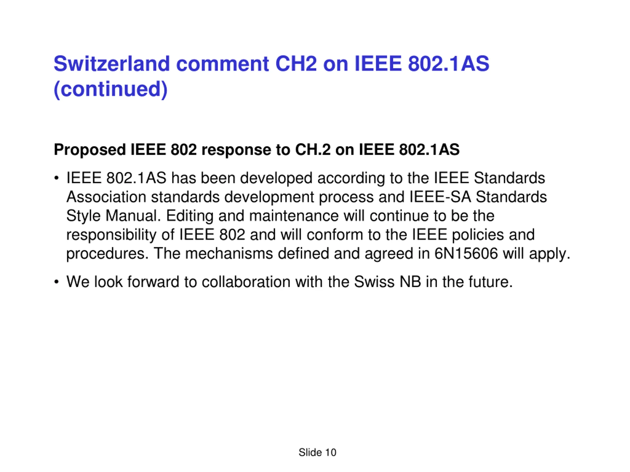 Switzerland comment CH2 on IEEE 802.1AS Switzerland comment CH2 on IEEE 802.1AS When the ISO/IEC/IEEE 8802-1AB standard has been endorsed by ISO/IEC, then the ISO Directives, Part 2, Rules for the structure and drafting of International Standards as well as the JTC 1 Supplement and the relevant JTC 1 Standing Documents must be considered. It is desirable that the next revision of the specification be in line with the applicable requirements. This is a major aim of our comments. We will be pleased to find resolutions in fruitful collaboration with the IEEE 802.1 WG. Slide 9