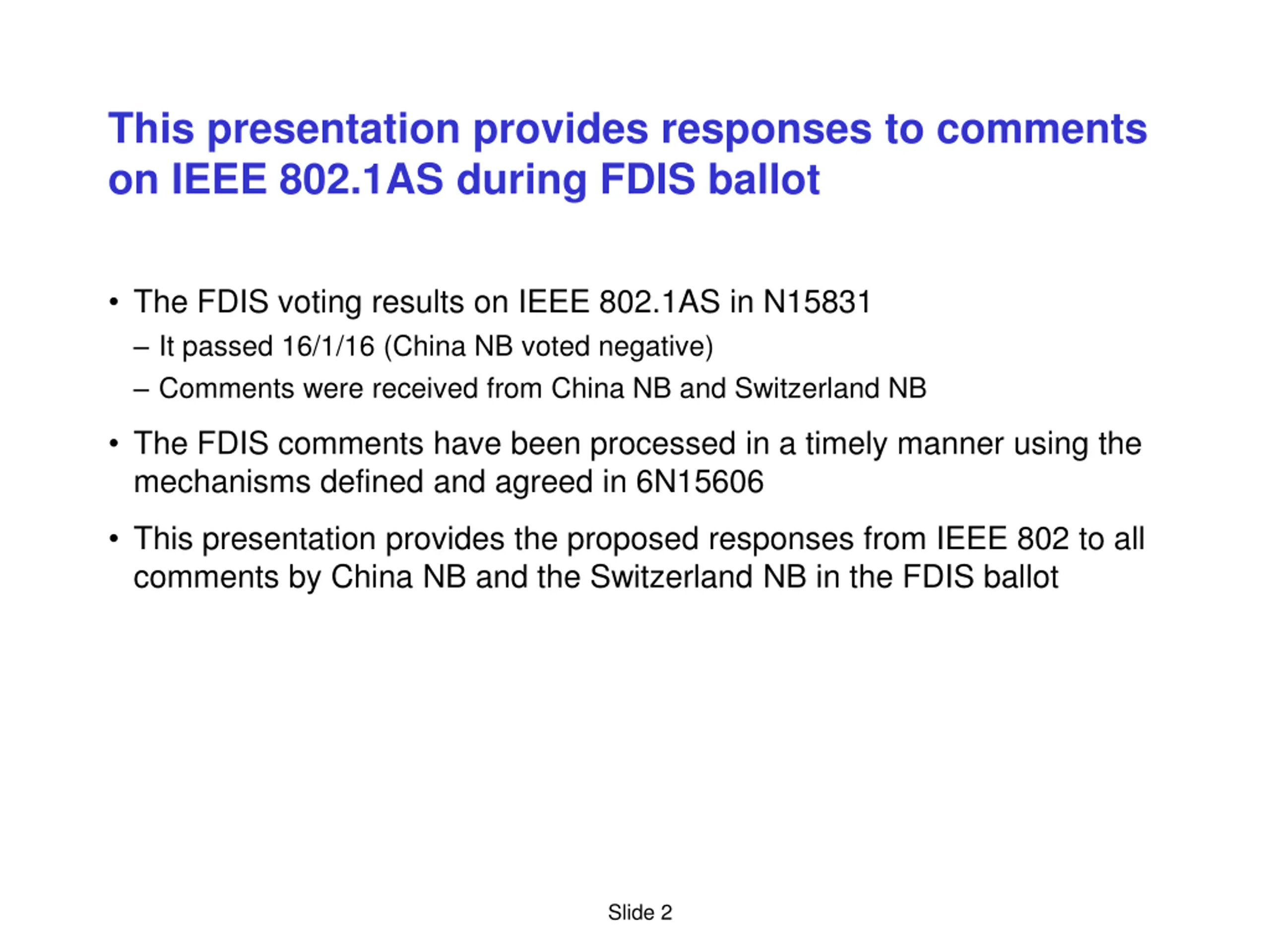 This presentation provides responses to comments on IEEE 802.1AS during FDIS ballot The FDIS voting results on IEEE 802.1AS in N15831 It passed 16/1/16 (China NB voted negative) Comments were received from China NB and Switzerland NB The FDIS comments have been processed in a timely manner using the mechanisms defined and agreed in 6N15606 This presentation provides the proposed responses from IEEE 802 to all comments by China NB and the Switzerland NB in the FDIS ballot Slide 2