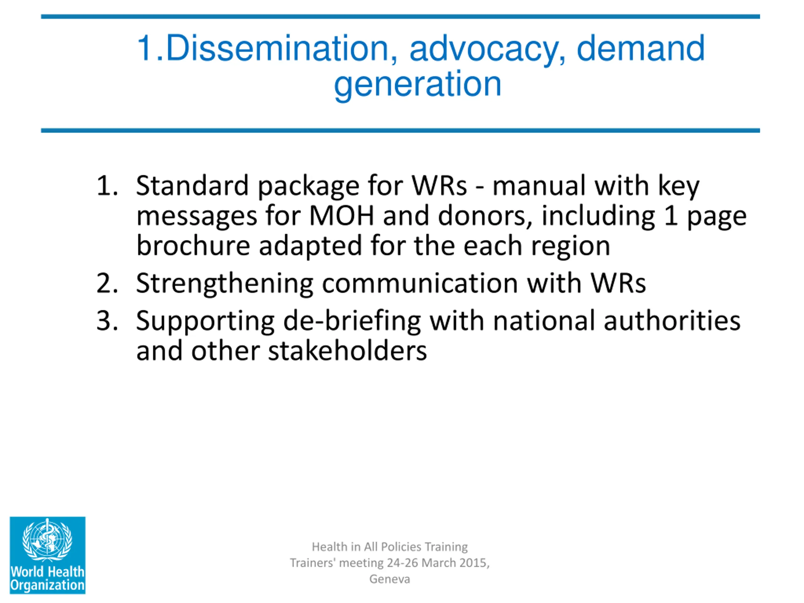 1.Dissemination, advocacy, demand generation 1. Standard package for WRs - manual with key messages for MOH and donors, including 1 page brochure adapted for the each region 2. Strengthening communication with WRs 3. Supporting de-briefing with national authorities and other stakeholders Health in All Policies Training Trainers' meeting 24-26 March 2015, Geneva