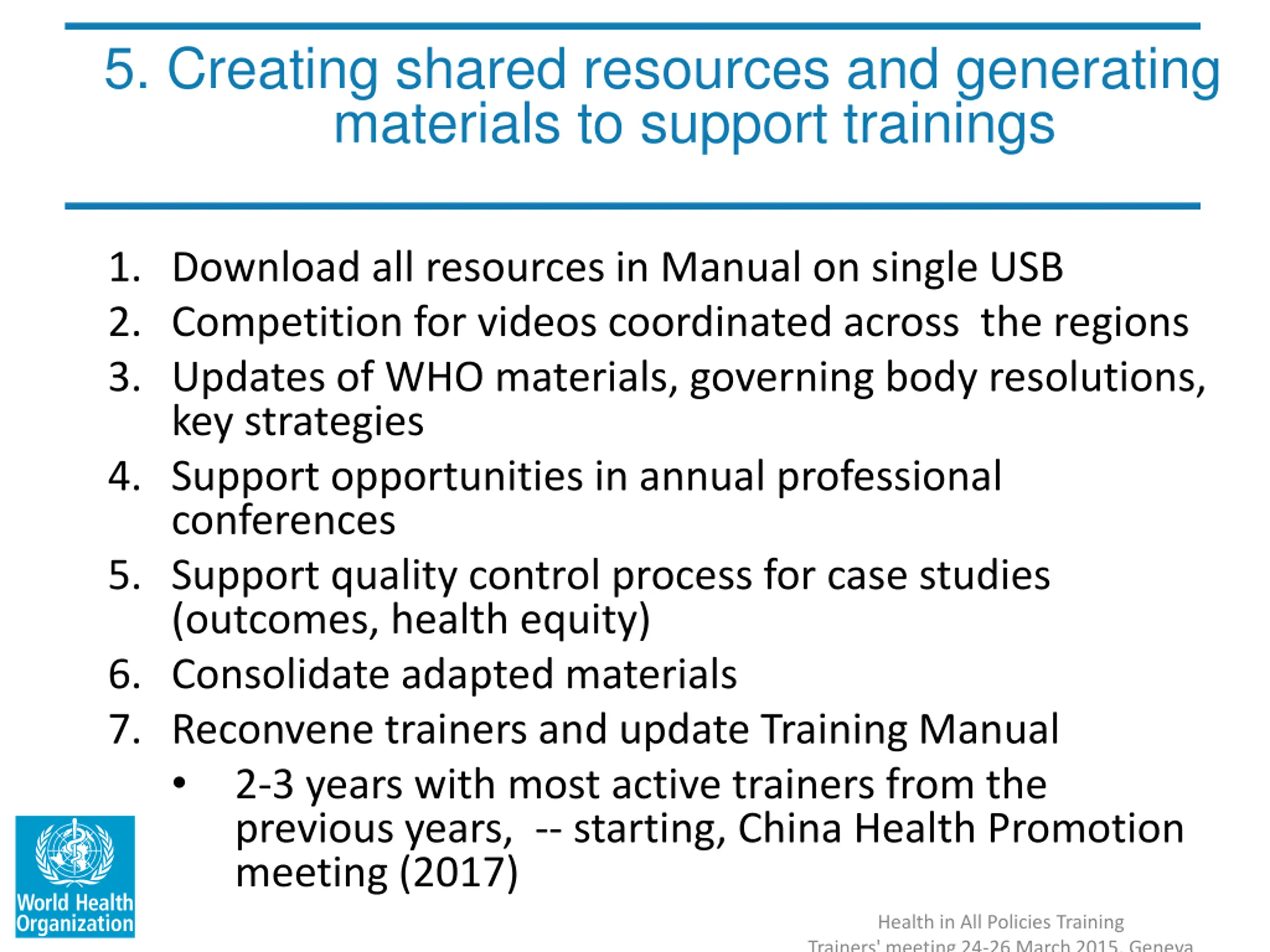 5. Creating shared resources and generating materials to support trainings 1. Download all resources in Manual on single USB 2. Competition for videos coordinated across the regions 3. Updates of WHO materials, governing body resolutions, key strategies 4. Support opportunities in annual professional conferences 5. Support quality control process for case studies (outcomes, health equity) 6. Consolidate adapted materials 7. Reconvene trainers and update Training Manual 2-3 years with most active trainers from the previous years, -- starting, China Health Promotion meeting (2017) Health in All Policies Training Trainers' meeting 24-26 March 2015, Geneva
