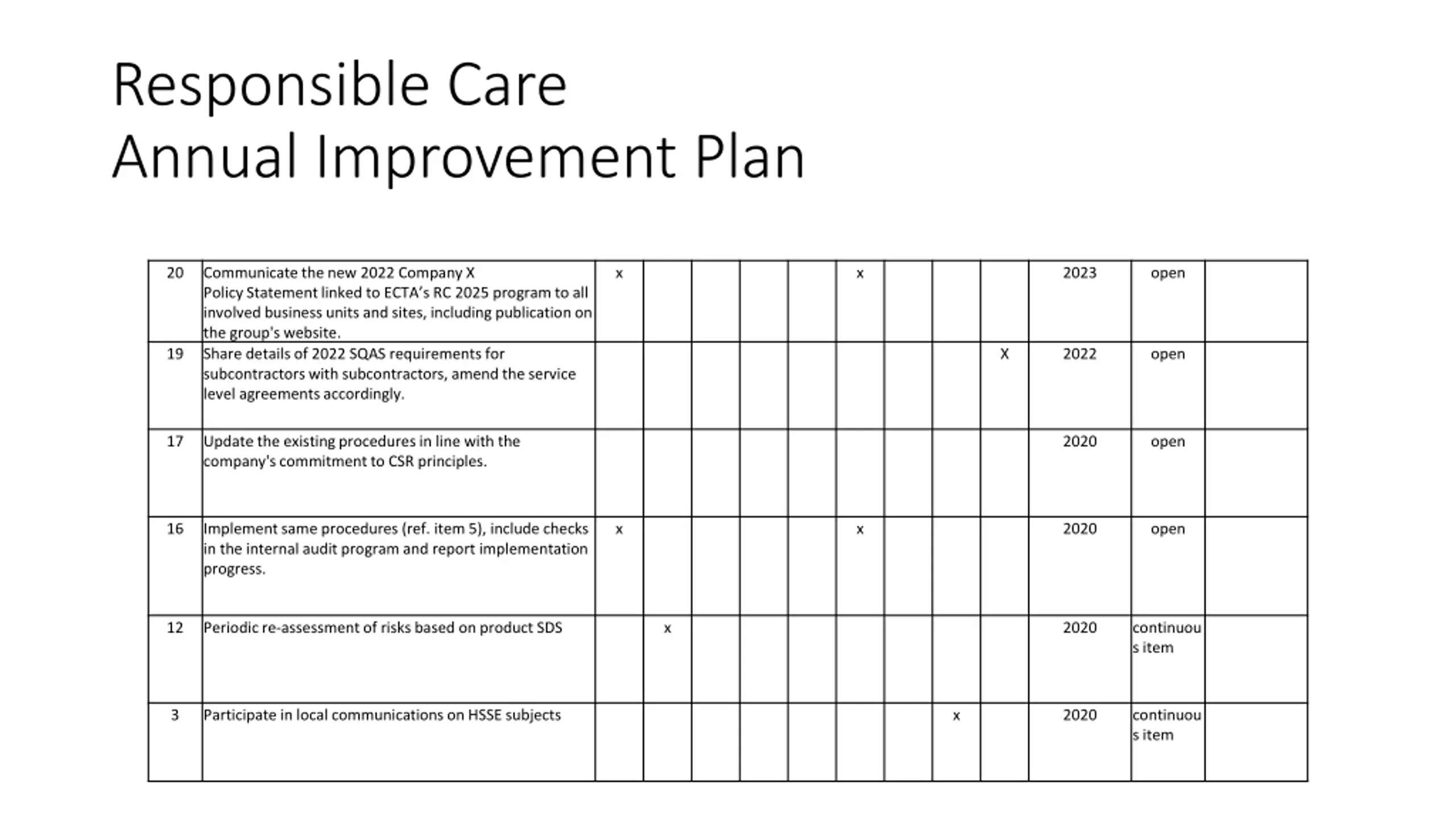 Responsible Care Annual Improvement Plan 20 Communicate the new 2022 Company X Policy Statement linked to ECTA s RC 2025 program to all involved business units and sites, including publication on the group's website. Share details of 2022 SQAS requirements for subcontractors with subcontractors, amend the service level agreements accordingly. x x 2023 open 19 X 2022 open 17 Update the existing procedures in line with the company's commitment to CSR principles. 2020 open 16 Implement same procedures (ref. item 5), include checks in the internal audit program and report implementation progress. x x 2020 open 12 Periodic re-assessment of risks based on product SDS x 2020 continuou s item 3 Participate in local communications on HSSE subjects x 2020 continuou s item