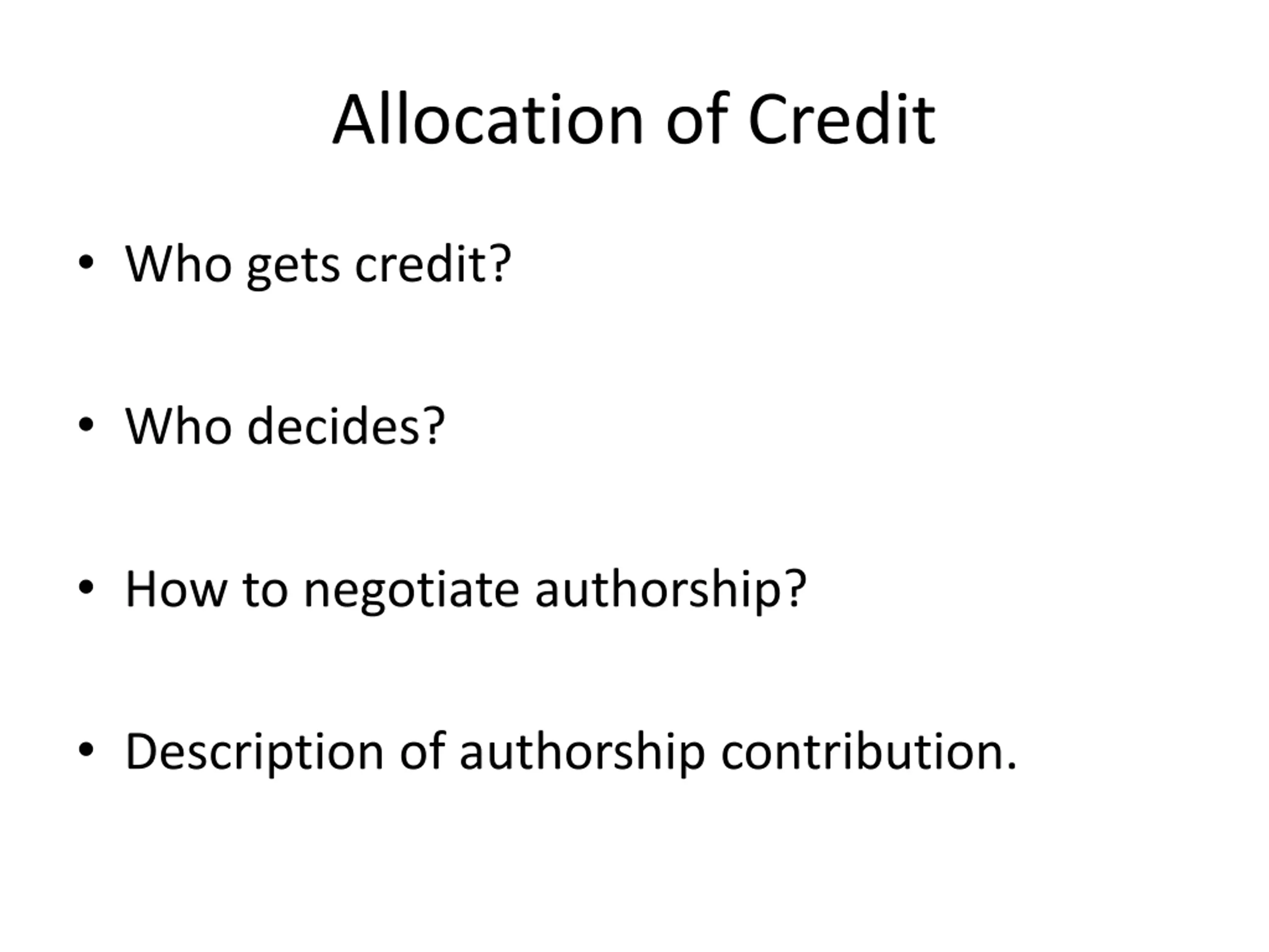 Allocation of Credit Who gets credit? Who decides? How to negotiate authorship? Description of authorship contribution.