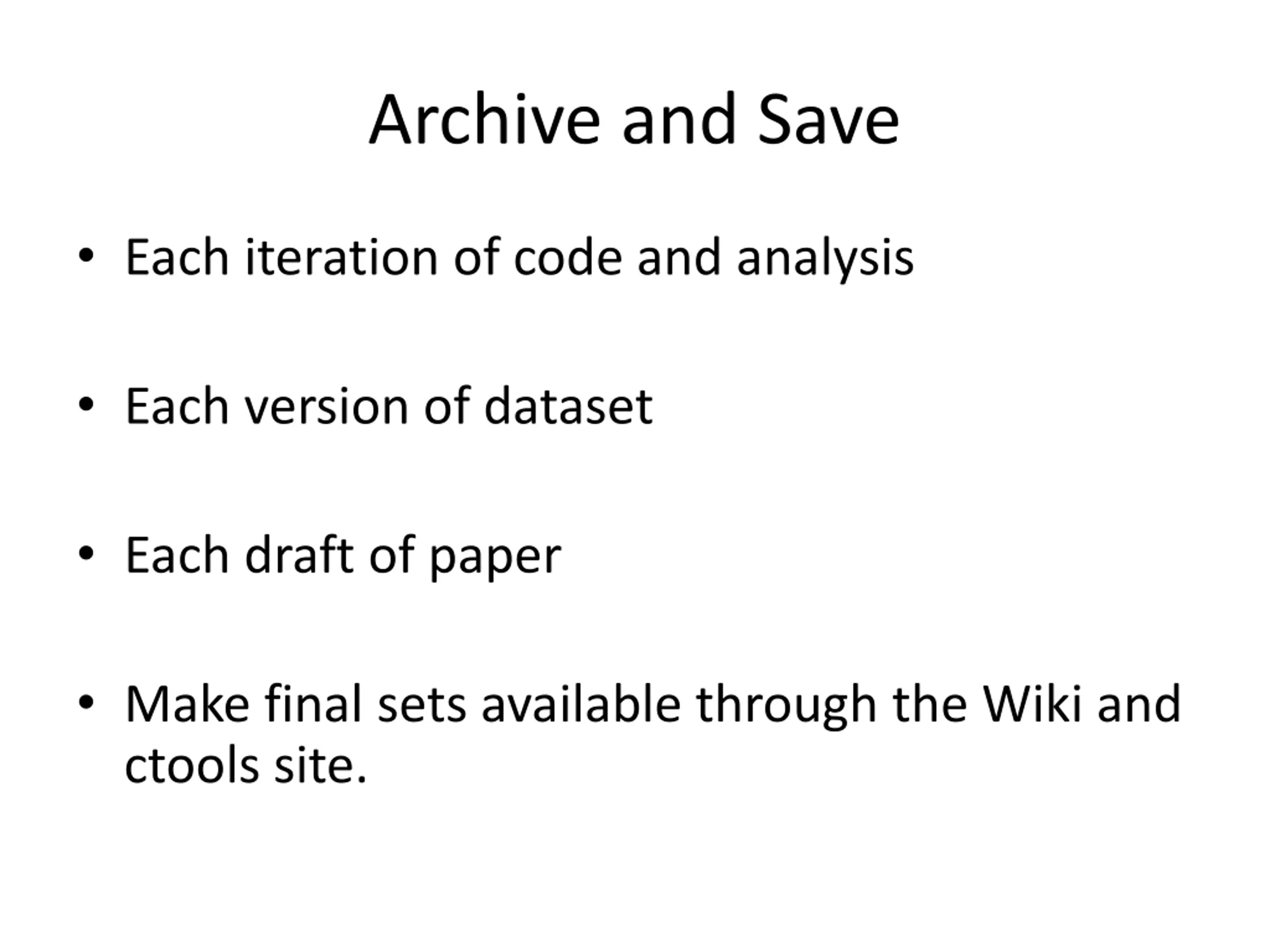 Archive and Save Each iteration of code and analysis Each version of dataset Each draft of paper Make final sets available through the Wiki and ctools site.