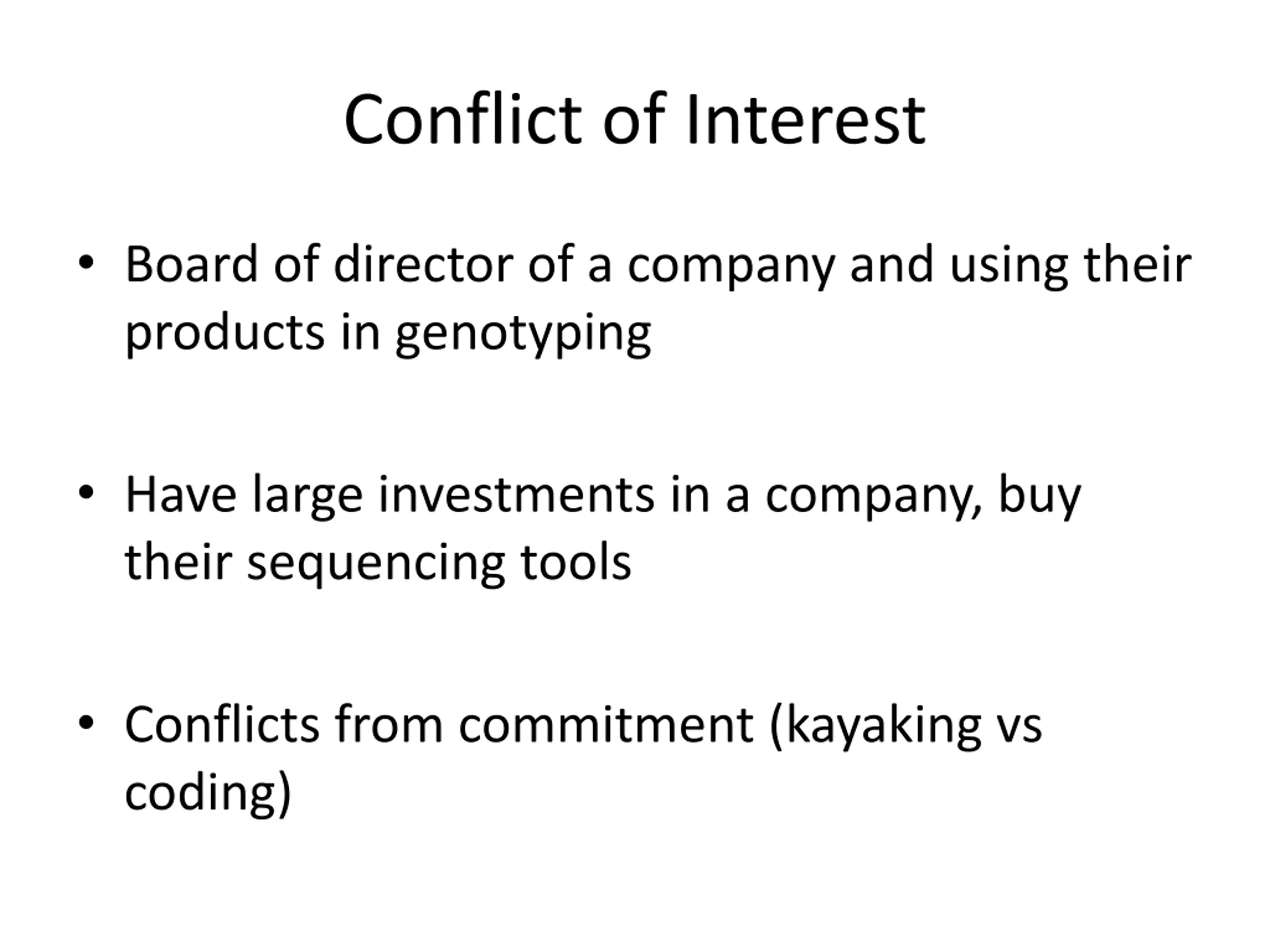 Conflict of Interest Board of director of a company and using their products in genotyping Have large investments in a company, buy their sequencing tools Conflicts from commitment (kayaking vs coding)