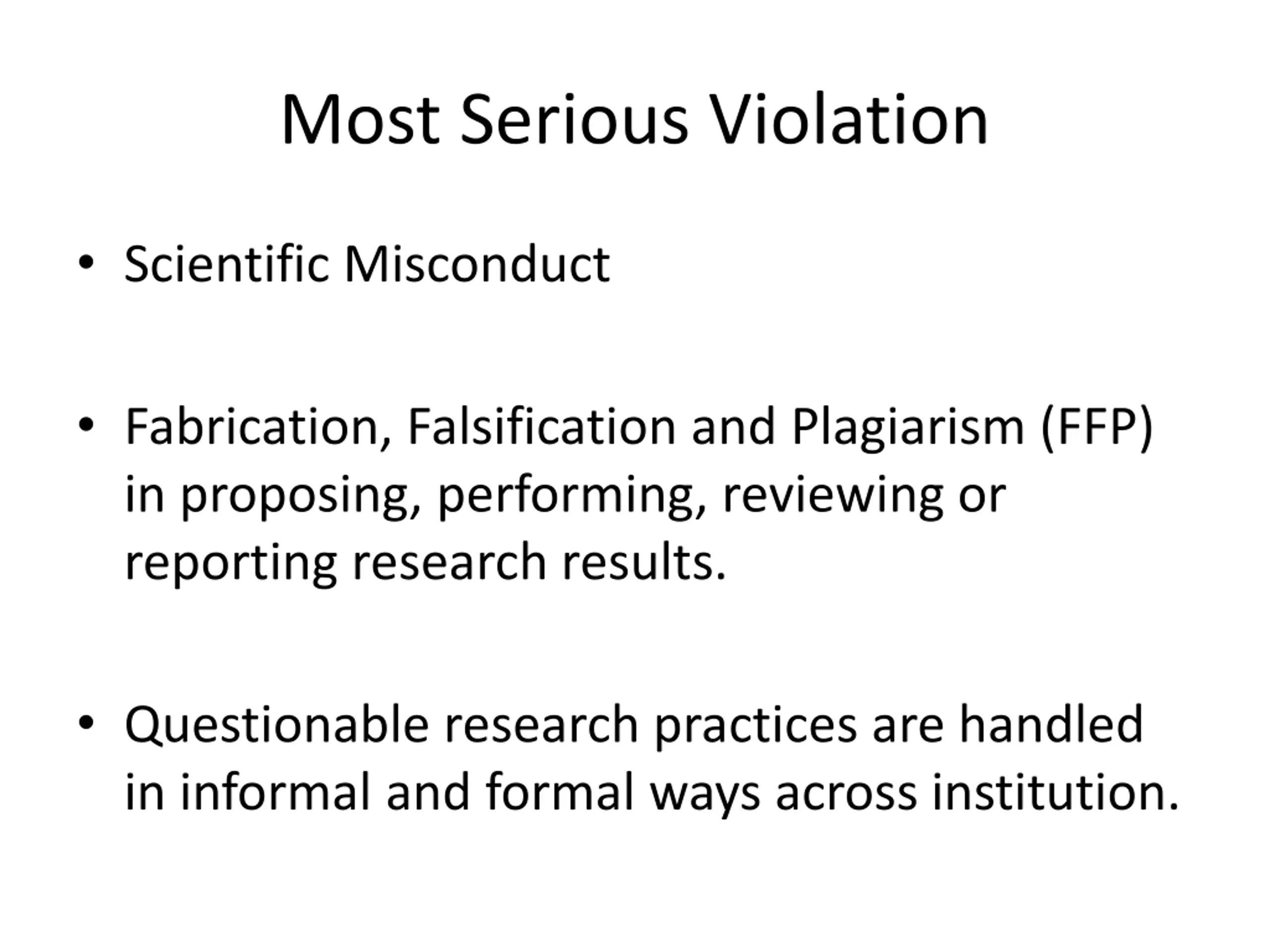 Most Serious Violation Scientific Misconduct Fabrication, Falsification and Plagiarism (FFP) in proposing, performing, reviewing or reporting research results. Questionable research practices are handled in informal and formal ways across institution.