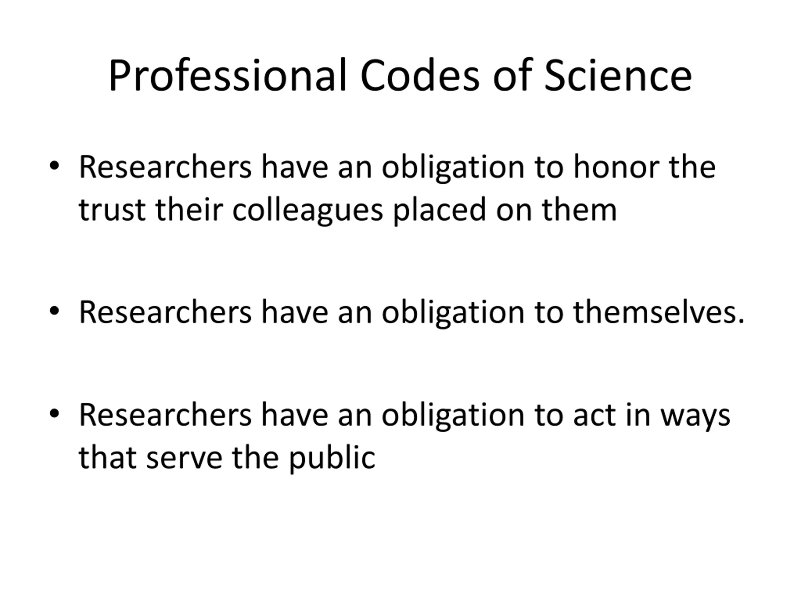 Professional Codes of Science Researchers have an obligation to honor the trust their colleagues placed on them Researchers have an obligation to themselves. Researchers have an obligation to act in ways that serve the public
