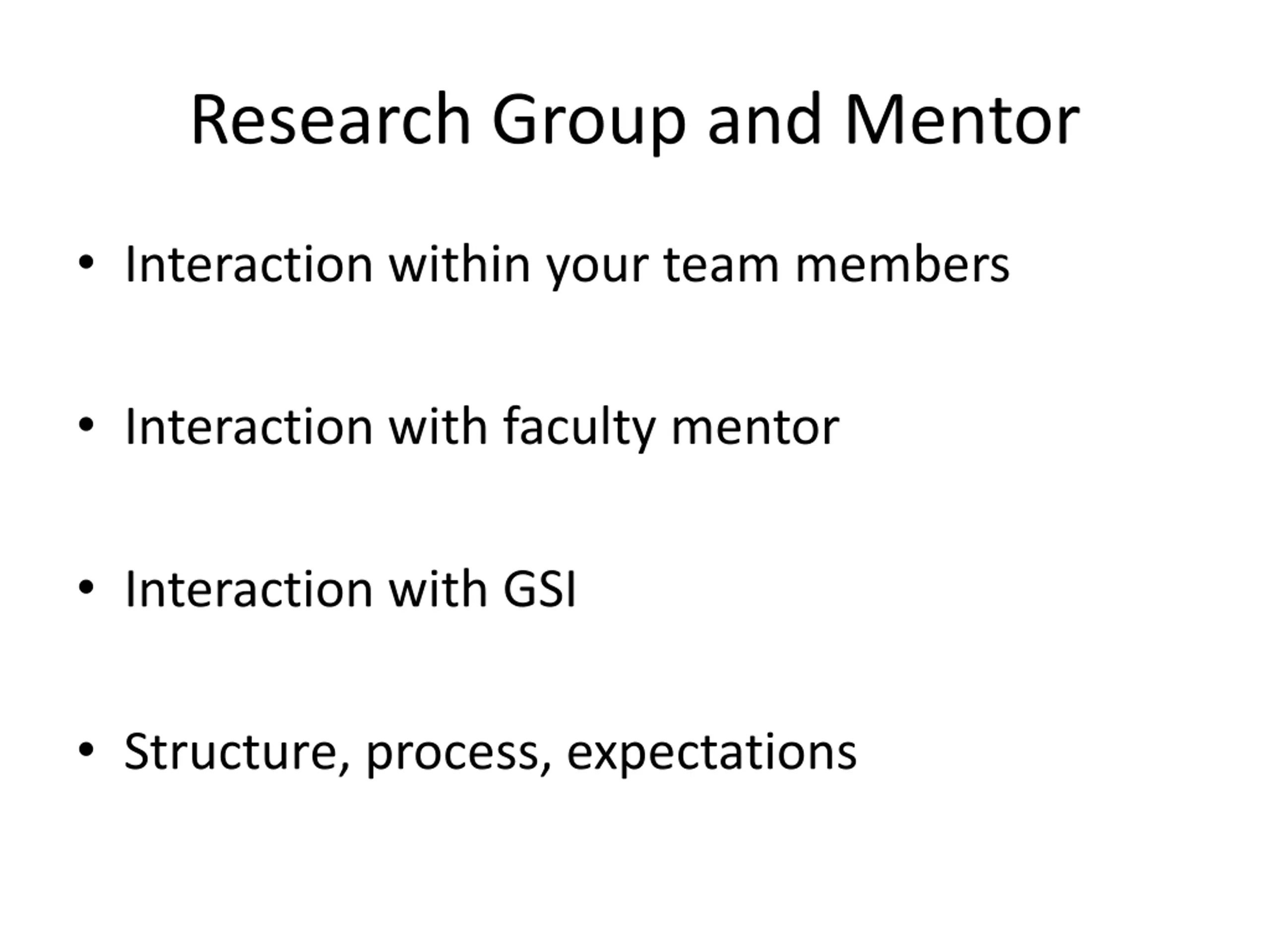 Research Group and Mentor Interaction within your team members Interaction with faculty mentor Interaction with GSI Structure, process, expectations