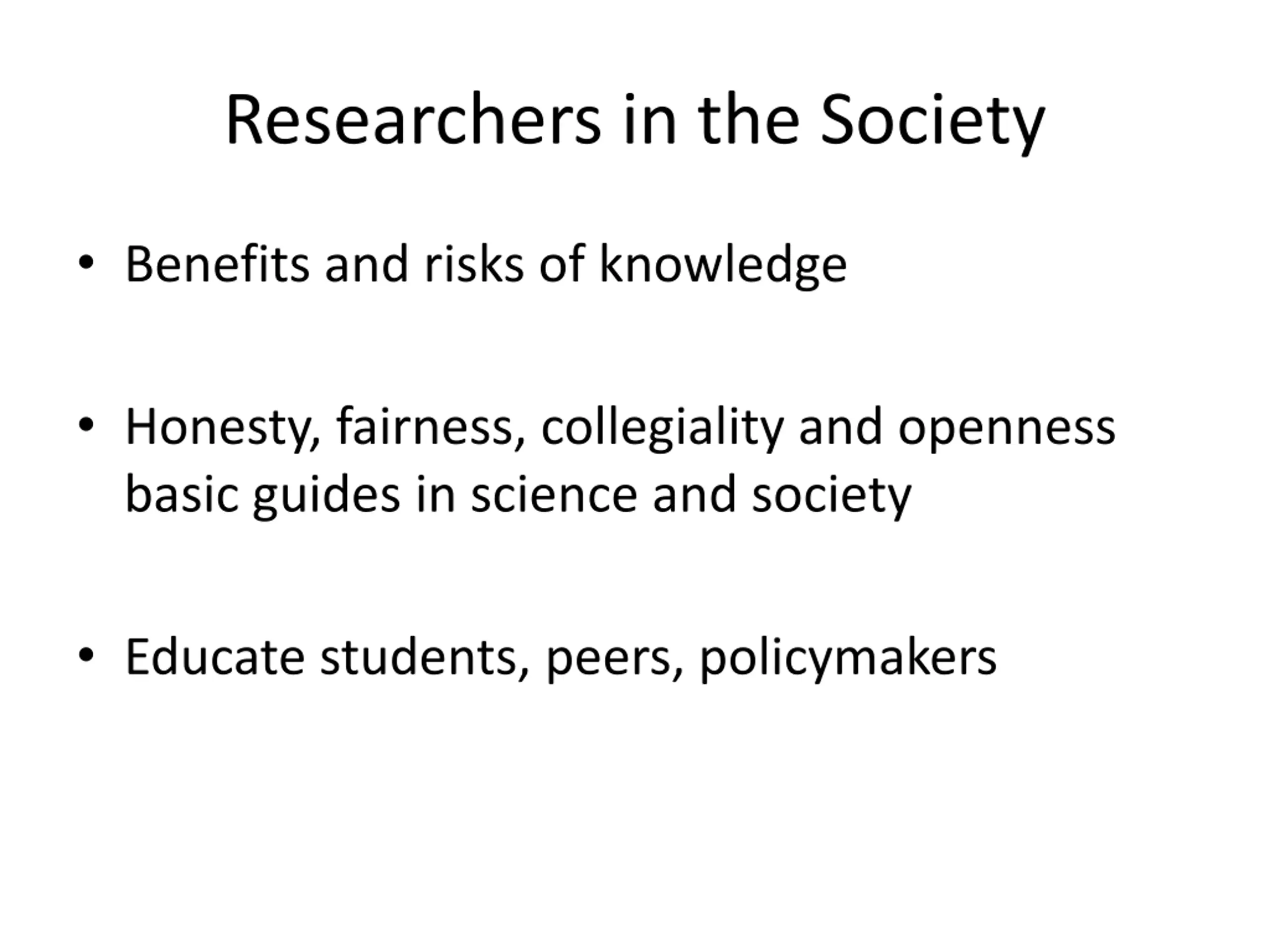 Researchers in the Society Benefits and risks of knowledge Honesty, fairness, collegiality and openness basic guides in science and society Educate students, peers, policymakers