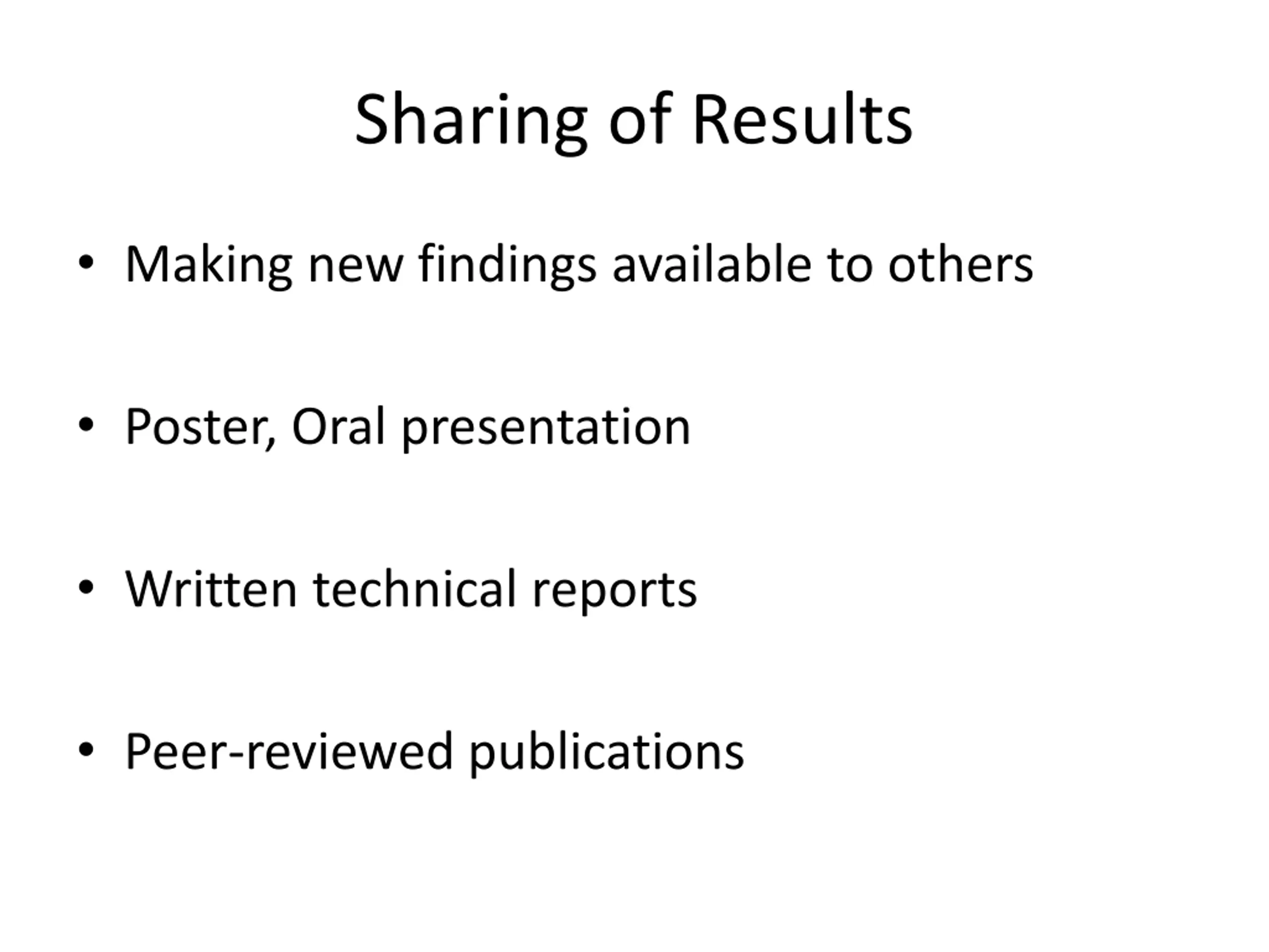 Sharing of Results Making new findings available to others Poster, Oral presentation Written technical reports Peer-reviewed publications