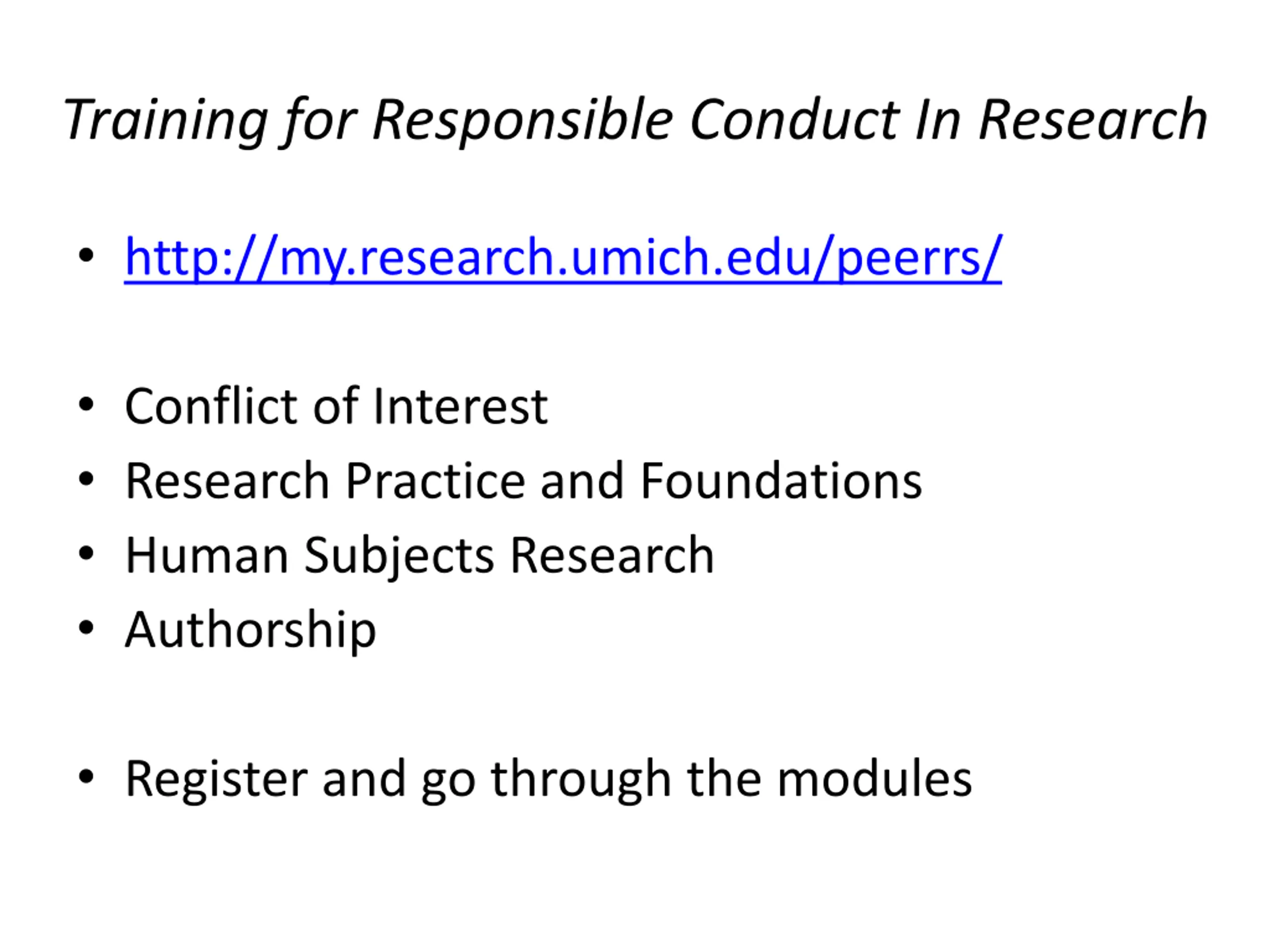 Training for Responsible Conduct In Research http://my.research.umich.edu/peerrs/ Conflict of Interest Research Practice and Foundations Human Subjects Research Authorship Register and go through the modules