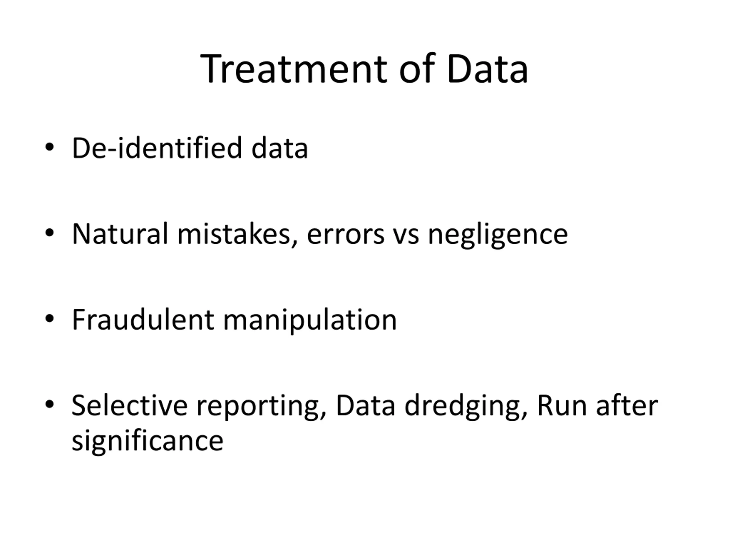 Treatment of Data De-identified data Natural mistakes, errors vs negligence Fraudulent manipulation Selective reporting, Data dredging, Run after significance