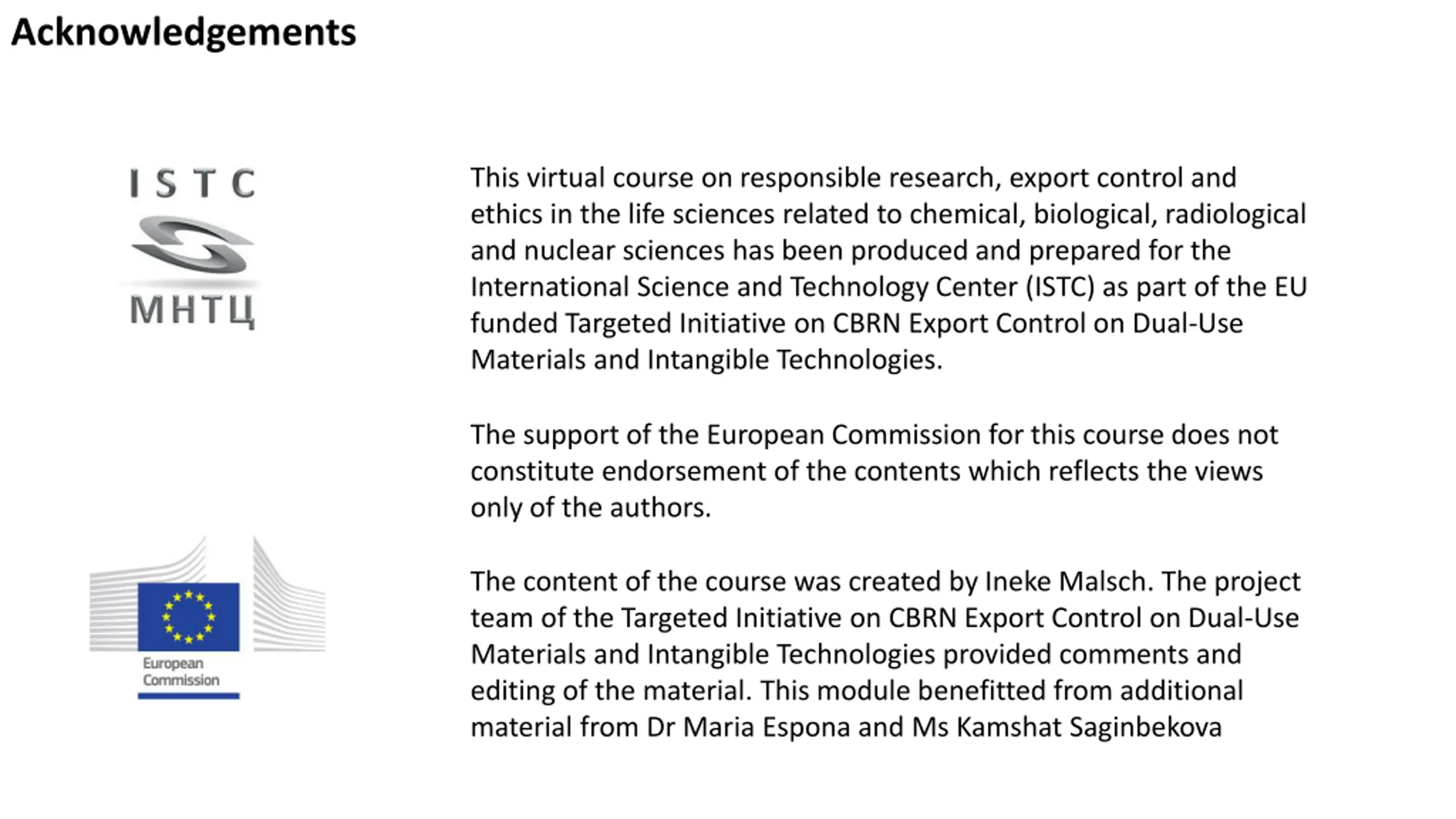 Acknowledgements This virtual course on responsible research, export control and ethics in the life sciences related to chemical, biological, radiological and nuclear sciences has been produced and prepared for the International Science and Technology Center (ISTC) as part of the EU funded Targeted Initiative on CBRN Export Control on Dual-Use Materials and Intangible Technologies. The support of the European Commission for this course does not constitute endorsement of the contents which reflects the views only of the authors. The content of the course was created by Ineke Malsch. The project team of the Targeted Initiative on CBRN Export Control on Dual-Use Materials and Intangible Technologies provided comments and editing of the material. This module benefitted from additional material from Dr Maria Espona and Ms Kamshat Saginbekova