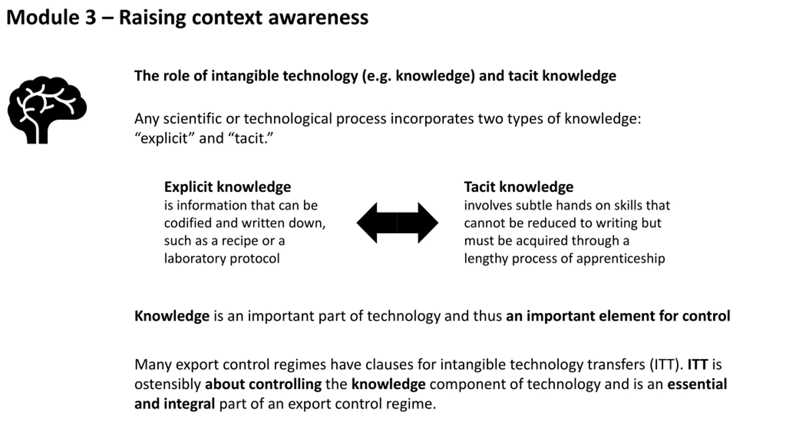 Module 3 Raising context awareness The role of intangible technology (e.g. knowledge) and tacit knowledge Any scientific or technological process incorporates two types of knowledge: explicit and tacit. Explicit knowledge Tacit knowledge is information that can be codified and written down, such as a recipe or a laboratory protocol involves subtle hands on skills that cannot be reduced to writing but must be acquired through a lengthy process of apprenticeship Knowledge is an important part of technology and thus an important element for control Many export control regimes have clauses for intangible technology transfers (ITT). ITT is ostensibly about controlling the knowledge component of technology and is an essential and integral part of an export control regime.