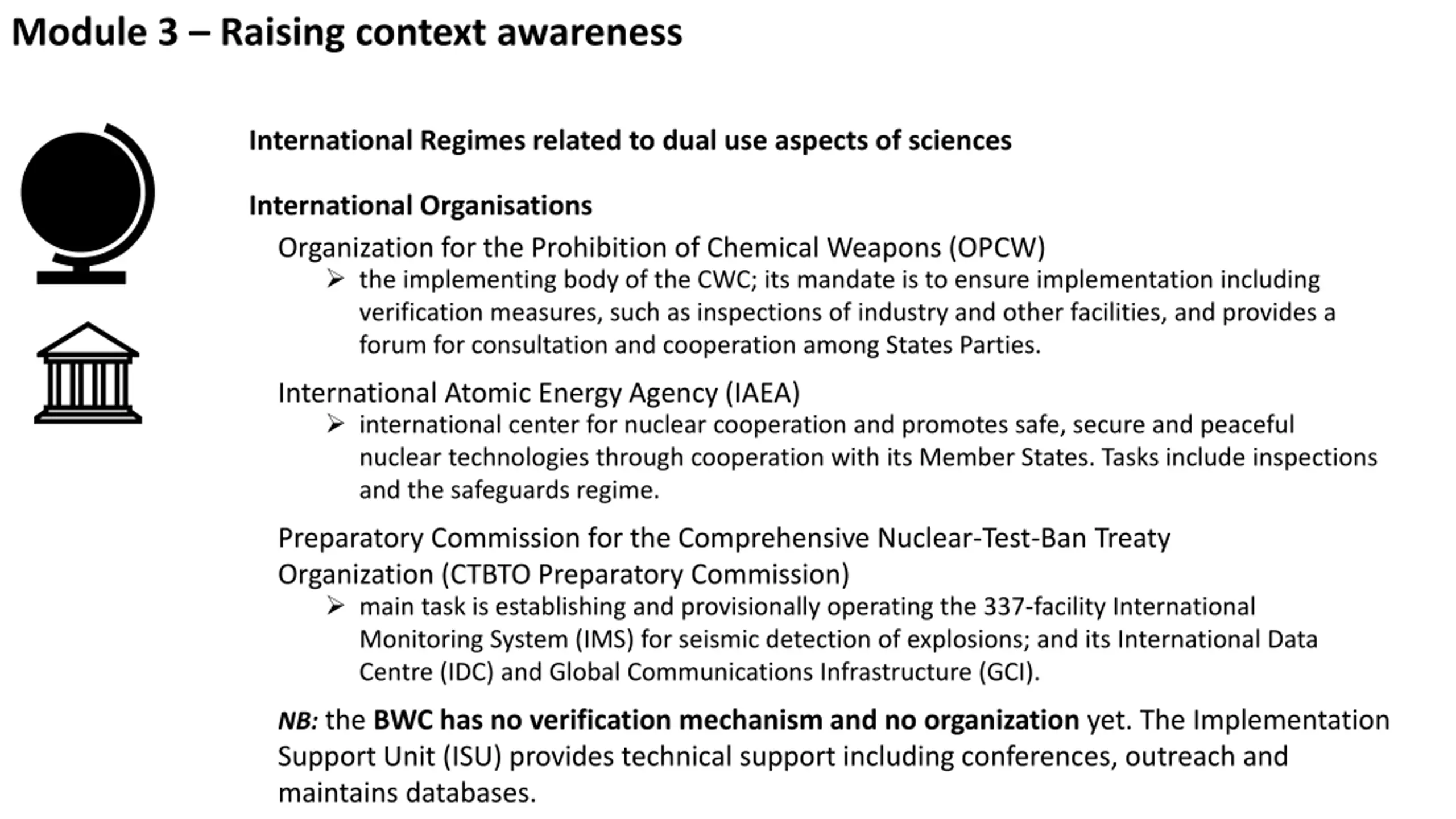 Module 3 Raising context awareness International Regimes related to dual use aspects of sciences International Organisations Organization for the Prohibition of Chemical Weapons (OPCW) the implementing body of the CWC; its mandate is to ensure implementation including verification measures, such as inspections of industry and other facilities, and provides a forum for consultation and cooperation among States Parties. International Atomic Energy Agency (IAEA) international center for nuclear cooperation and promotes safe, secure and peaceful nuclear technologies through cooperation with its Member States. Tasks include inspections and the safeguards regime. Preparatory Commission for the Comprehensive Nuclear-Test-Ban Treaty Organization (CTBTO Preparatory Commission) main task is establishing and provisionally operating the 337-facility International Monitoring System (IMS) for seismic detection of explosions; and its International Data Centre (IDC) and Global Communications Infrastructure (GCI). NB: the BWC has no verification mechanism and no organization yet. The Implementation Support Unit (ISU) provides technical support including conferences, outreach and maintains databases.