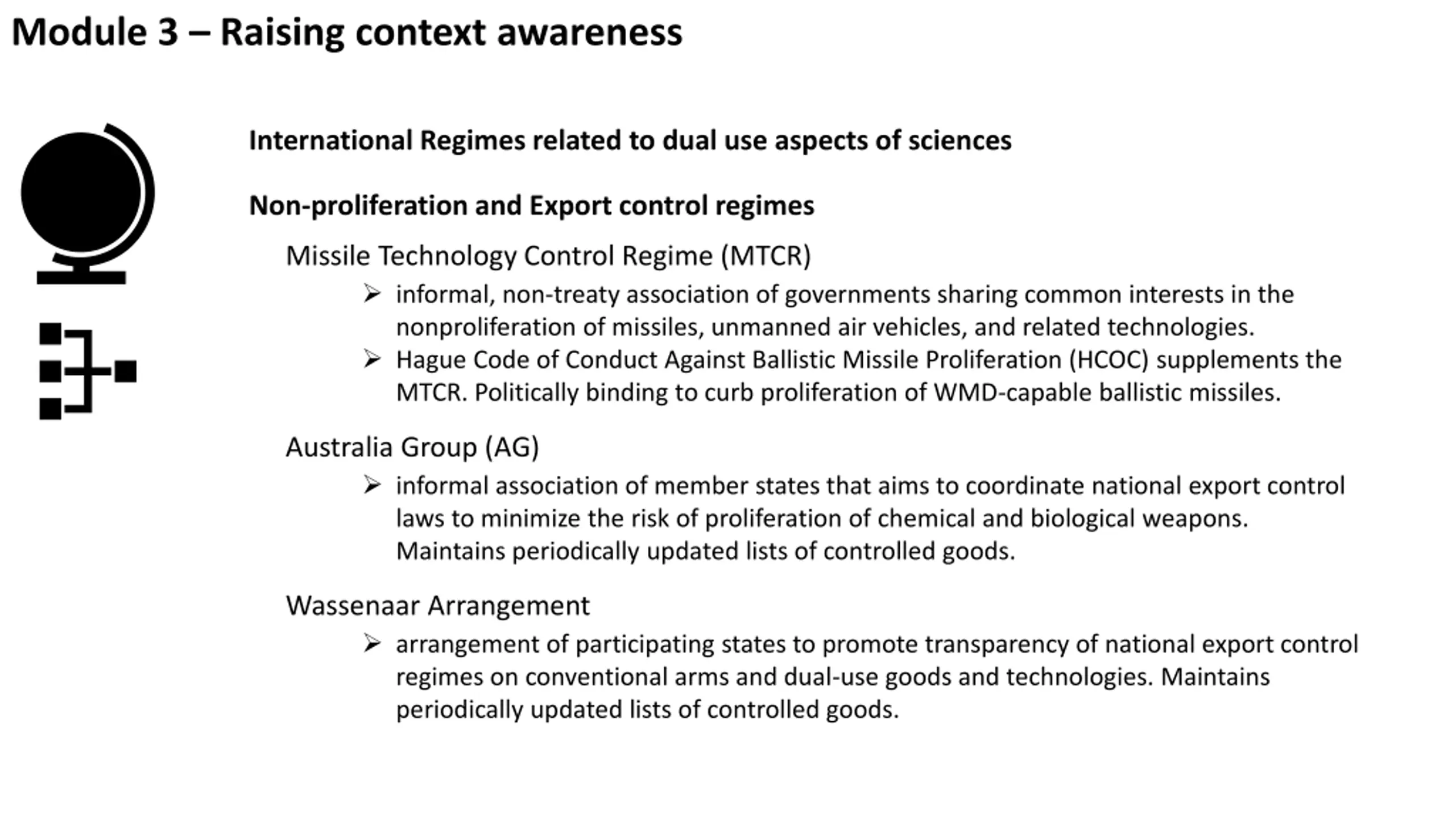 Module 3 Raising context awareness International Regimes related to dual use aspects of sciences Non-proliferation and Export control regimes Missile Technology Control Regime (MTCR) informal, non-treaty association of governments sharing common interests in the nonproliferation of missiles, unmanned air vehicles, and related technologies. Hague Code of Conduct Against Ballistic Missile Proliferation (HCOC) supplements the MTCR. Politically binding to curb proliferation of WMD-capable ballistic missiles. Australia Group (AG) informal association of member states that aims to coordinate national export control laws to minimize the risk of proliferation of chemical and biological weapons. Maintains periodically updated lists of controlled goods. Wassenaar Arrangement arrangement of participating states to promote transparency of national export control regimes on conventional arms and dual-use goods and technologies. Maintains periodically updated lists of controlled goods.