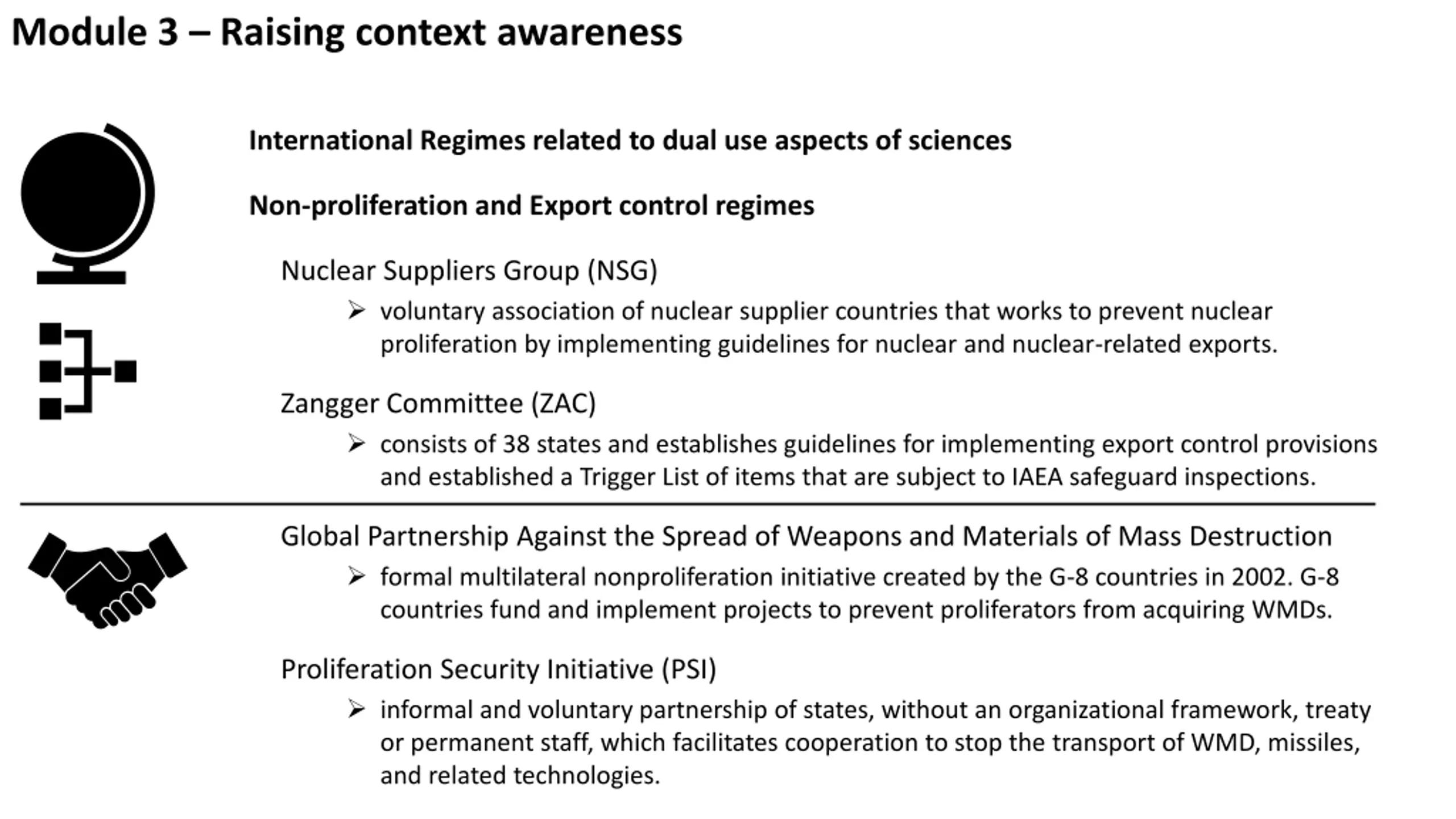 Module 3 Raising context awareness International Regimes related to dual use aspects of sciences Non-proliferation and Export control regimes Nuclear Suppliers Group (NSG) voluntary association of nuclear supplier countries that works to prevent nuclear proliferation by implementing guidelines for nuclear and nuclear-related exports. Zangger Committee (ZAC) consists of 38 states and establishes guidelines for implementing export control provisions and established a Trigger List of items that are subject to IAEA safeguard inspections. Global Partnership Against the Spread of Weapons and Materials of Mass Destruction formal multilateral nonproliferation initiative created by the G-8 countries in 2002. G-8 countries fund and implement projects to prevent proliferators from acquiring WMDs. Proliferation Security Initiative (PSI) informal and voluntary partnership of states, without an organizational framework, treaty or permanent staff, which facilitates cooperation to stop the transport of WMD, missiles, and related technologies.