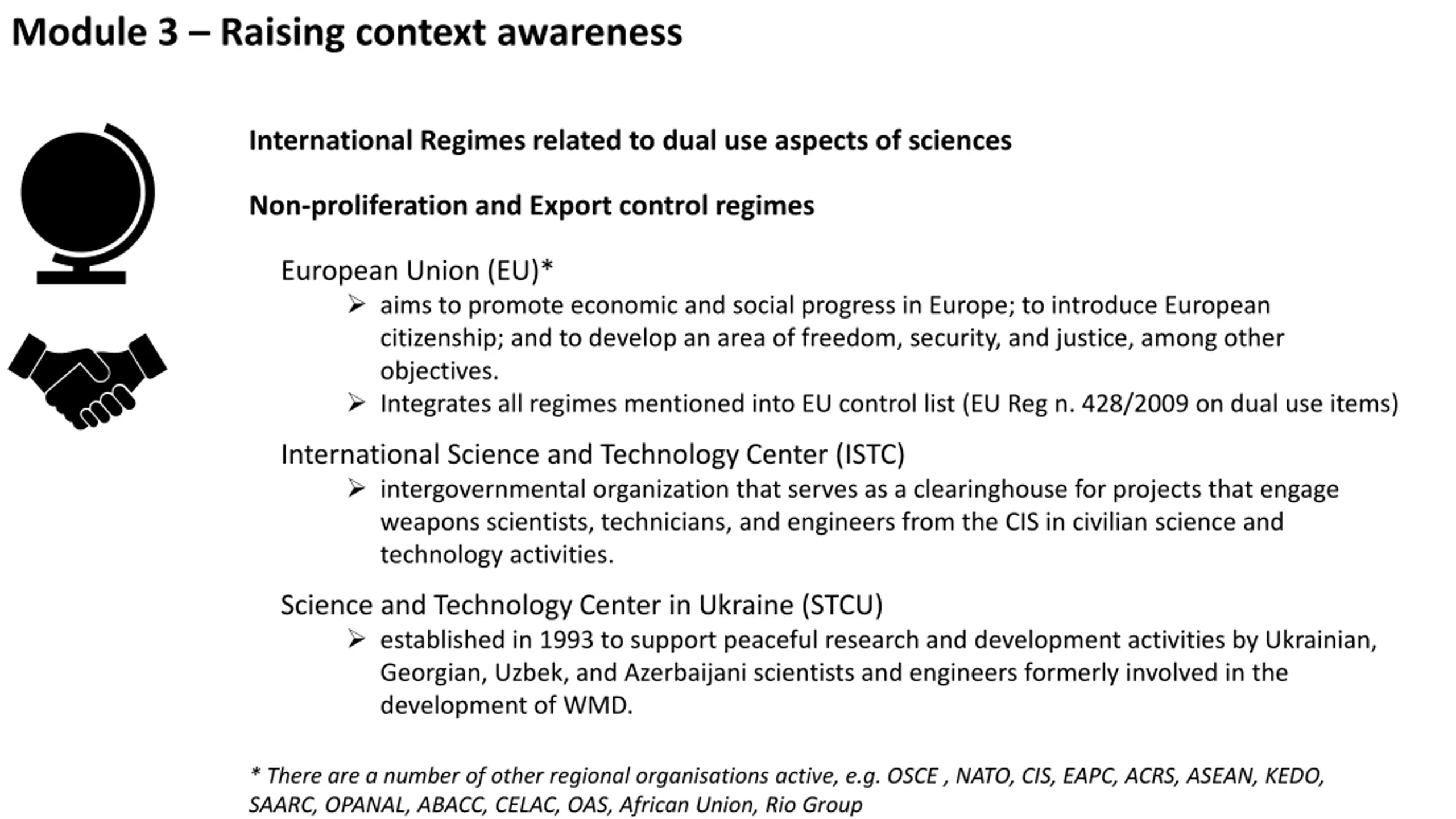 Module 3 Raising context awareness International Regimes related to dual use aspects of sciences Non-proliferation and Export control regimes European Union (EU)* aims to promote economic and social progress in Europe; to introduce European citizenship; and to develop an area of freedom, security, and justice, among other objectives. Integrates all regimes mentioned into EU control list (EU Reg n. 428/2009 on dual use items) International Science and Technology Center (ISTC) intergovernmental organization that serves as a clearinghouse for projects that engage weapons scientists, technicians, and engineers from the CIS in civilian science and technology activities. Science and Technology Center in Ukraine (STCU) established in 1993 to support peaceful research and development activities by Ukrainian, Georgian, Uzbek, and Azerbaijani scientists and engineers formerly involved in the development of WMD. * There are a number of other regional organisations active, e.g. OSCE , NATO, CIS, EAPC, ACRS, ASEAN, KEDO, SAARC, OPANAL, ABACC, CELAC, OAS, African Union, Rio Group