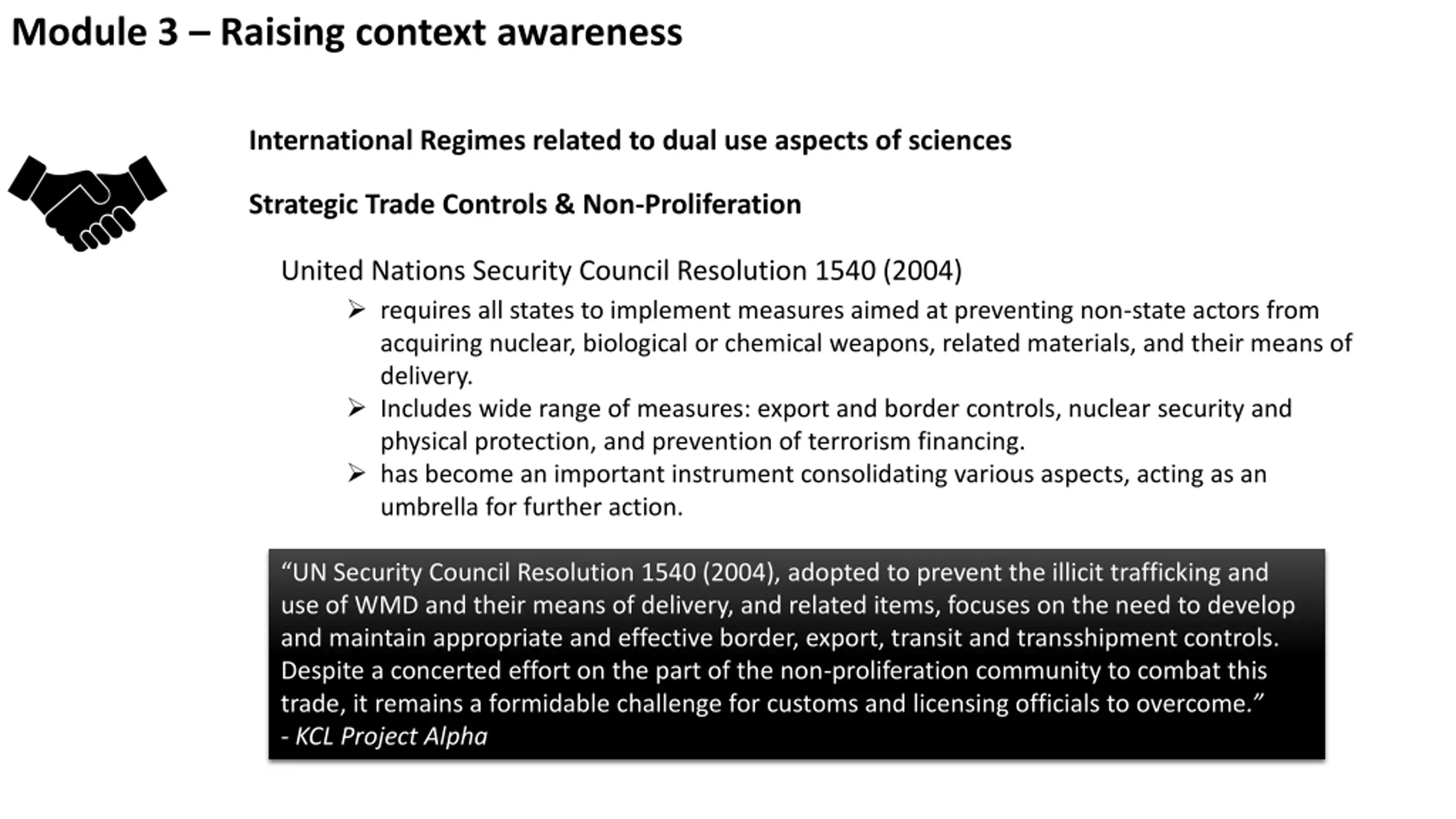 Module 3 Raising context awareness International Regimes related to dual use aspects of sciences Strategic Trade Controls & Non-Proliferation United Nations Security Council Resolution 1540 (2004) requires all states to implement measures aimed at preventing non-state actors from acquiring nuclear, biological or chemical weapons, related materials, and their means of delivery. Includes wide range of measures: export and border controls, nuclear security and physical protection, and prevention of terrorism financing. has become an important instrument consolidating various aspects, acting as an umbrella for further action. UN Security Council Resolution 1540 (2004), adopted to prevent the illicit trafficking and use of WMD and their means of delivery, and related items, focuses on the need to develop and maintain appropriate and effective border, export, transit and transshipment controls. Despite a concerted effort on the part of the non-proliferation community to combat this trade, it remains a formidable challenge for customs and licensing officials to overcome. - KCL Project Alpha