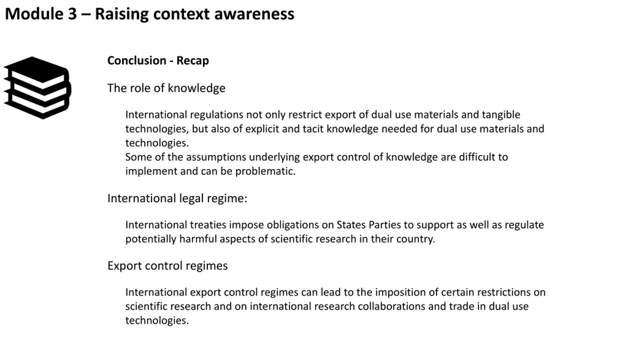 Module 3 Raising context awareness Conclusion - Recap The role of knowledge International regulations not only restrict export of dual use materials and tangible technologies, but also of explicit and tacit knowledge needed for dual use materials and technologies. Some of the assumptions underlying export control of knowledge are difficult to implement and can be problematic. International legal regime: International treaties impose obligations on States Parties to support as well as regulate potentially harmful aspects of scientific research in their country. Export control regimes International export control regimes can lead to the imposition of certain restrictions on scientific research and on international research collaborations and trade in dual use technologies.