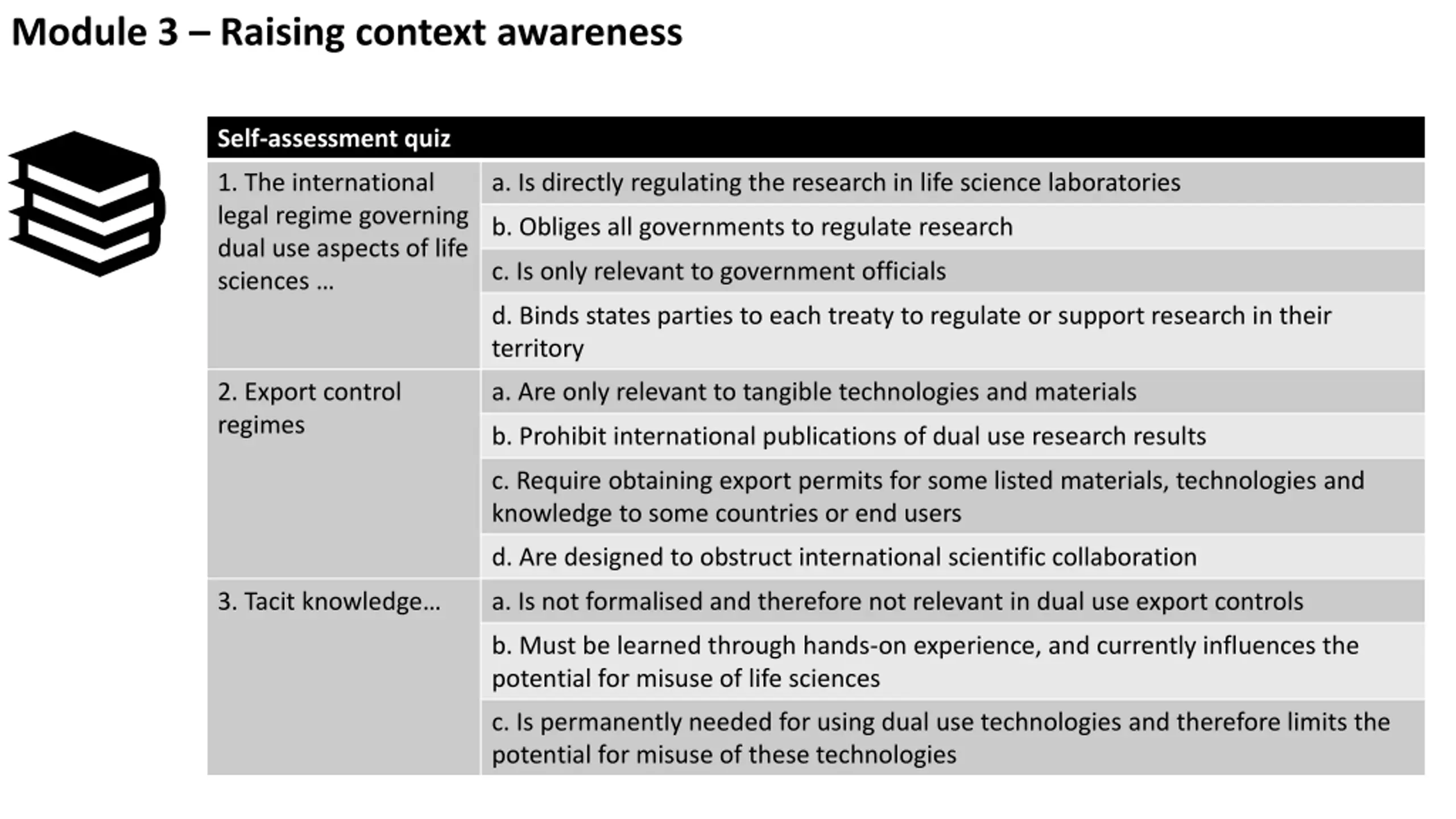 Module 3 Raising context awareness Self-assessment quiz 1. The international legal regime governing dual use aspects of life sciences a. Is directly regulating the research in life science laboratories b. Obliges all governments to regulate research c. Is only relevant to government officials d. Binds states parties to each treaty to regulate or support research in their territory 2. Export control regimes a. Are only relevant to tangible technologies and materials b. Prohibit international publications of dual use research results c. Require obtaining export permits for some listed materials, technologies and knowledge to some countries or end users d. Are designed to obstruct international scientific collaboration 3. Tacit knowledge a. Is not formalised and therefore not relevant in dual use export controls b. Must be learned through hands-on experience, and currently influences the potential for misuse of life sciences c. Is permanently needed for using dual use technologies and therefore limits the potential for misuse of these technologies