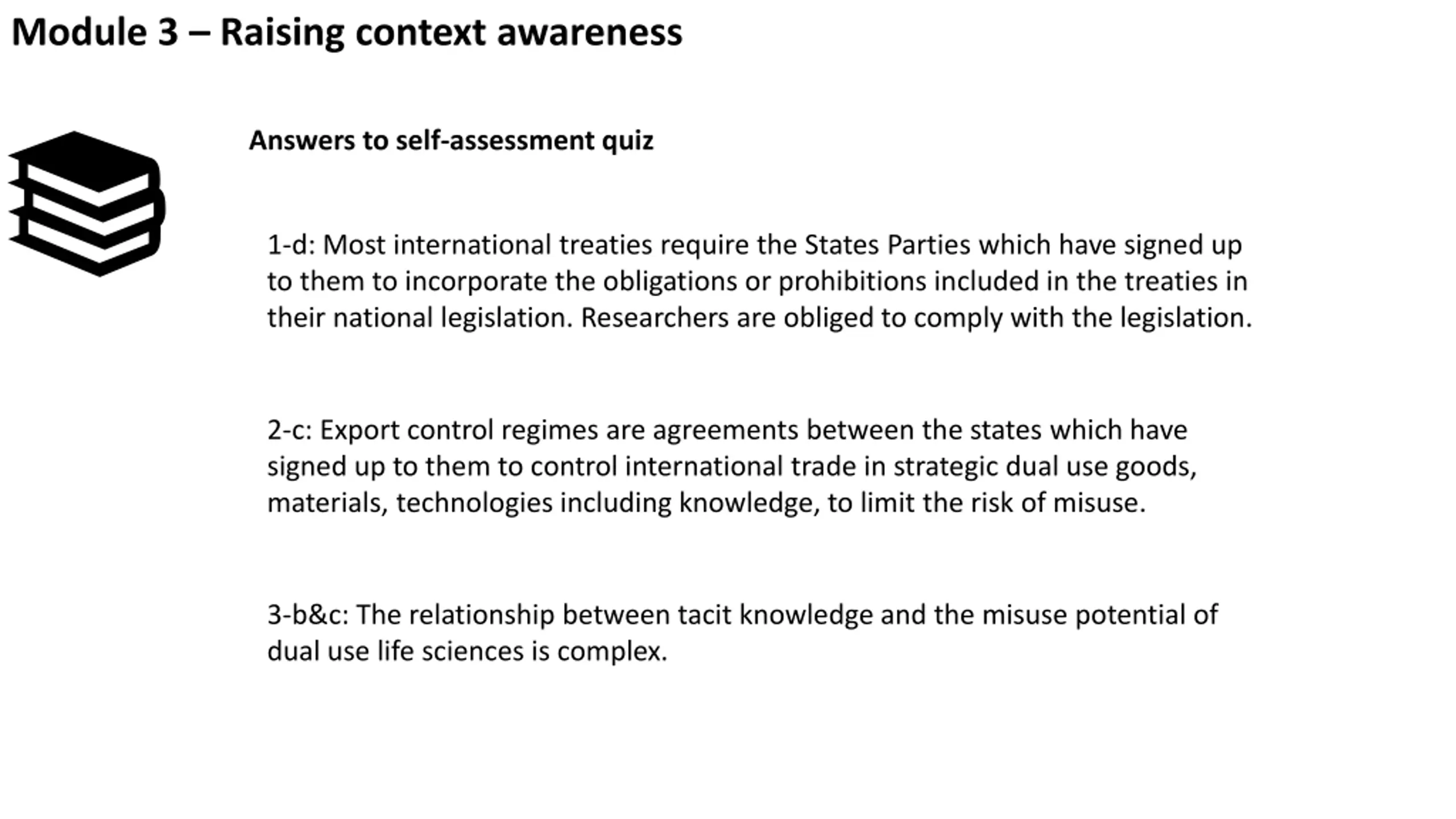 Module 3 Raising context awareness Answers to self-assessment quiz 1-d: Most international treaties require the States Parties which have signed up to them to incorporate the obligations or prohibitions included in the treaties in their national legislation. Researchers are obliged to comply with the legislation. 2-c: Export control regimes are agreements between the states which have signed up to them to control international trade in strategic dual use goods, materials, technologies including knowledge, to limit the risk of misuse. 3-b&c: The relationship between tacit knowledge and the misuse potential of dual use life sciences is complex.
