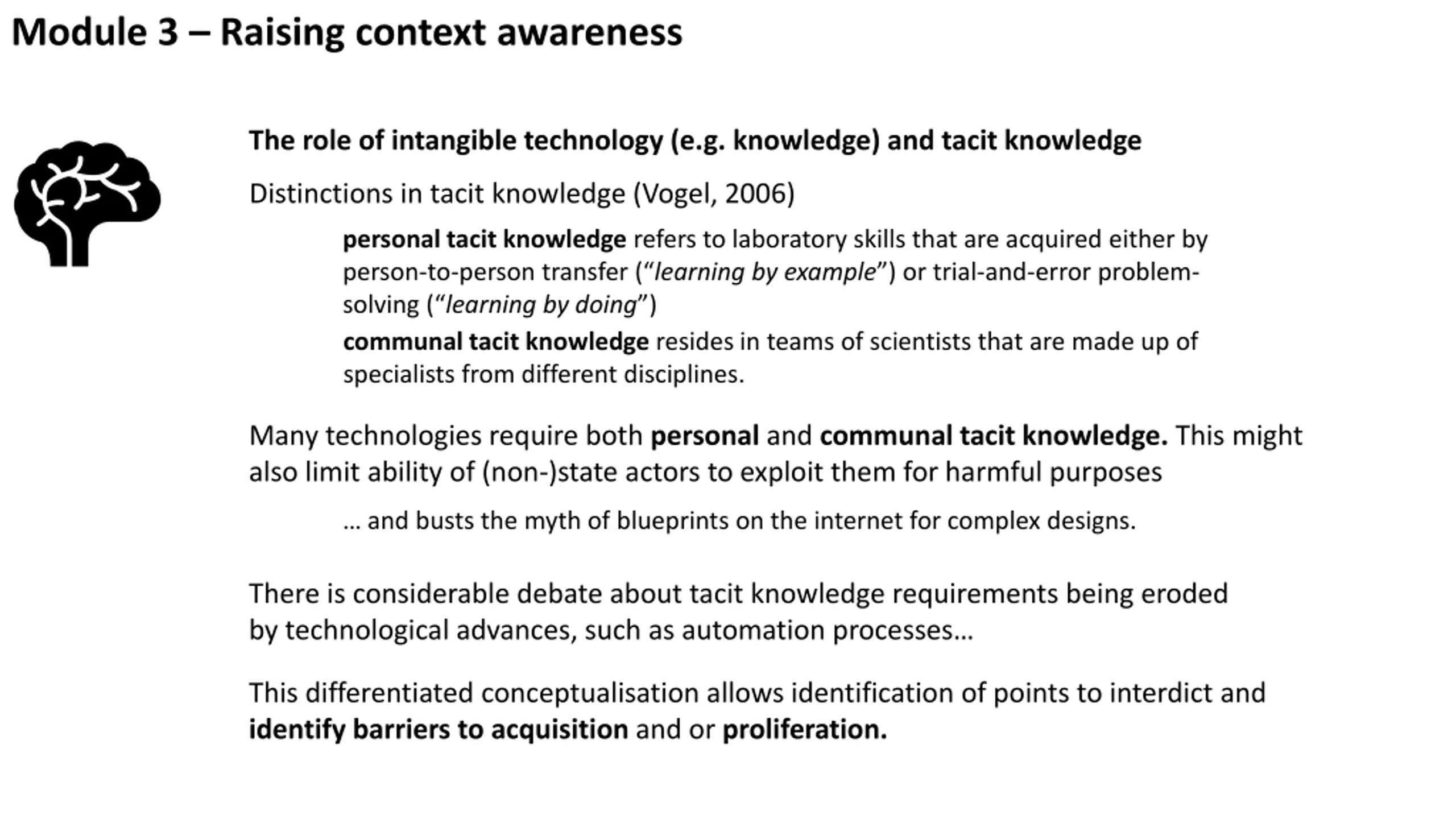 Module 3 Raising context awareness The role of intangible technology (e.g. knowledge) and tacit knowledge Distinctions in tacit knowledge (Vogel, 2006) personal tacit knowledge refers to laboratory skills that are acquired either by person-to-person transfer ( learning by example ) or trial-and-error problem- solving ( learning by doing ) communal tacit knowledge resides in teams of scientists that are made up of specialists from different disciplines. Many technologies require both personal and communaltacitknowledge. This might also limit ability of (non-)state actors to exploit them for harmful purposes and busts the myth of blueprints on the internet for complex designs. There is considerable debate about tacit knowledge requirements being eroded by technological advances, such as automation processes This differentiated conceptualisation allows identification of points to interdict and identify barriersto acquisition and or proliferation.