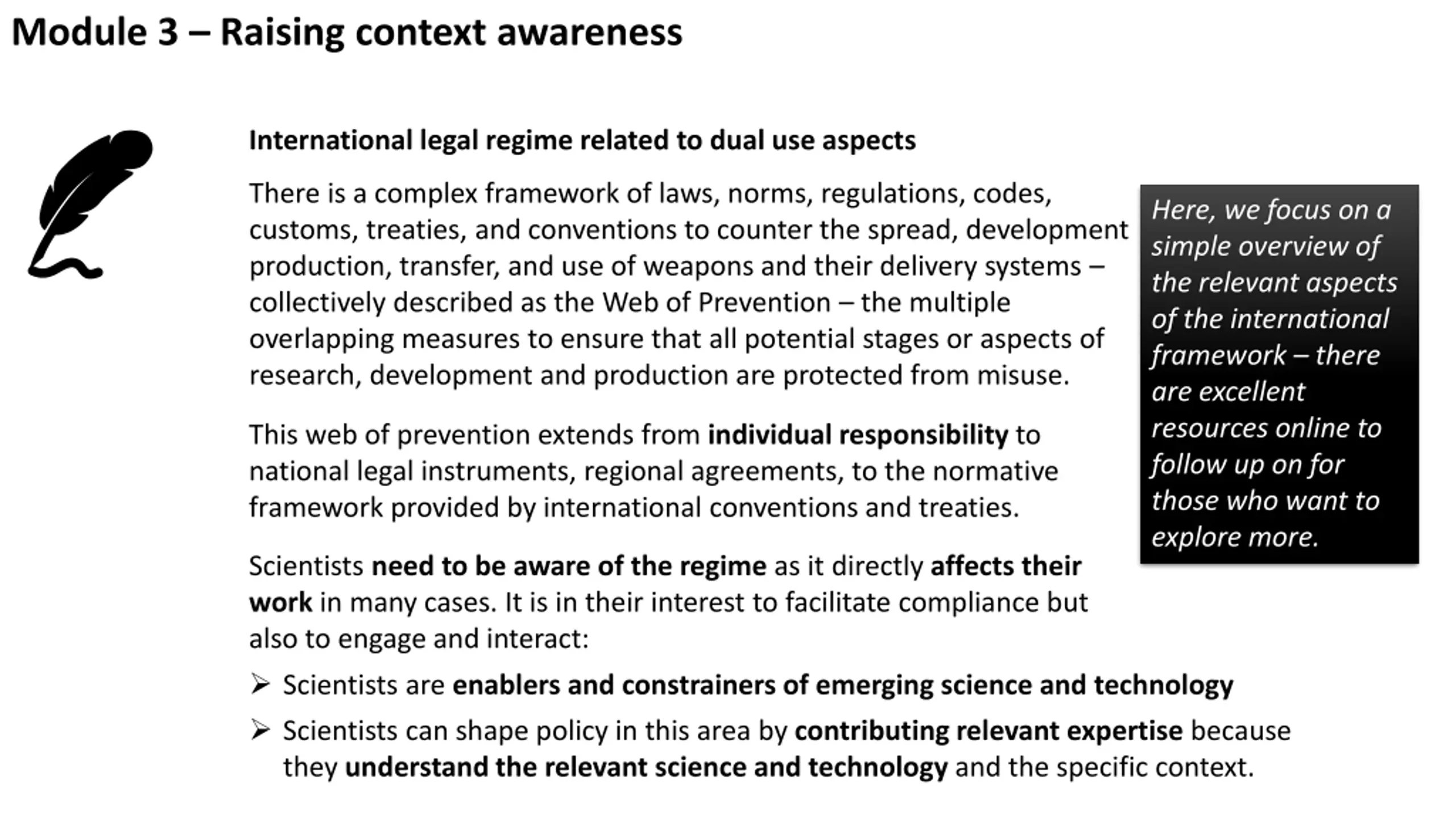 Module 3 Raising context awareness International legal regime related to dual use aspects There is a complex framework of laws, norms, regulations, codes, customs, treaties, and conventions to counter the spread, development production, transfer, and use of weapons and their delivery systems collectively described as the Web of Prevention the multiple overlapping measures to ensure that all potential stages or aspects of research, development and production are protected from misuse. Here, we focus on a simple overview of the relevant aspects of the international framework there are excellent resources online to follow up on for those who want to explore more. This web of prevention extends from individual responsibility to national legal instruments, regional agreements, to the normative framework provided by international conventions and treaties. Scientists need to be aware of the regime as it directly affects their work in many cases. It is in their interest to facilitate compliance but also to engage and interact: Scientists are enablers and constrainers of emerging science and technology Scientists can shape policy in this area by contributing relevant expertise because they understand the relevant science and technology and the specific context.